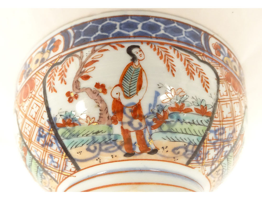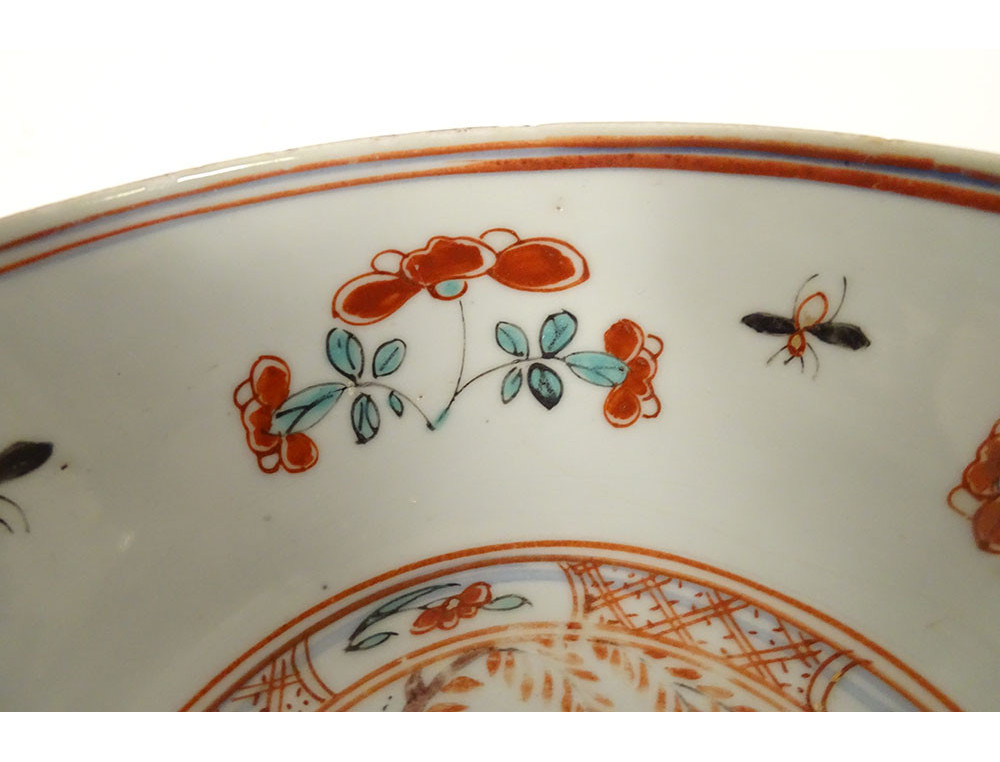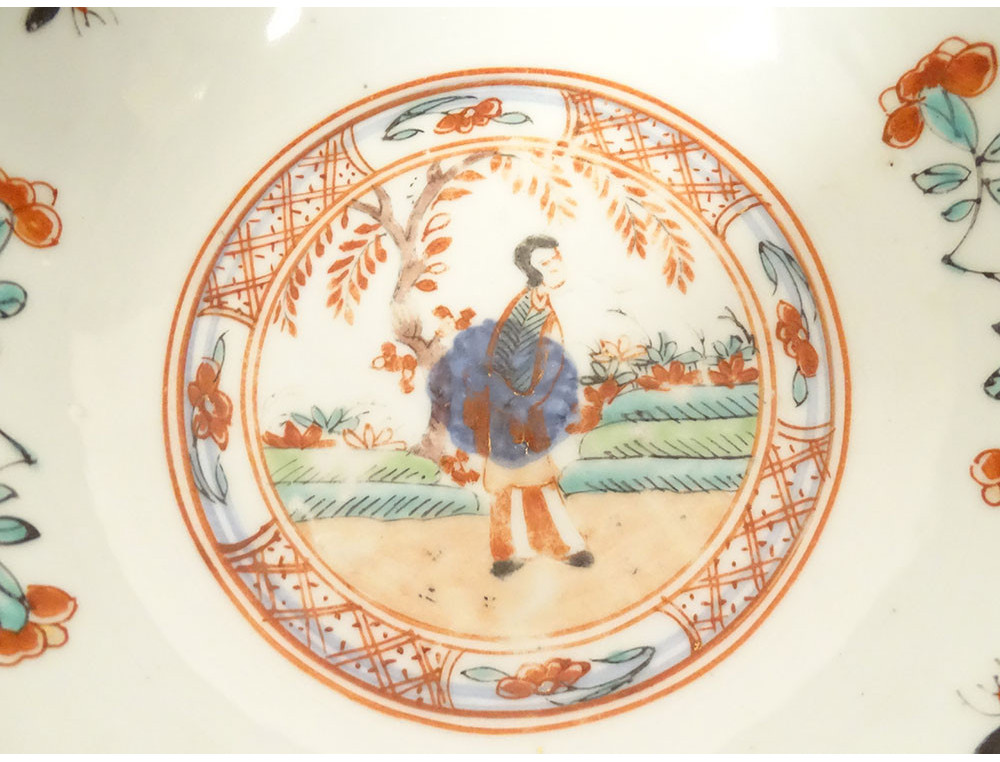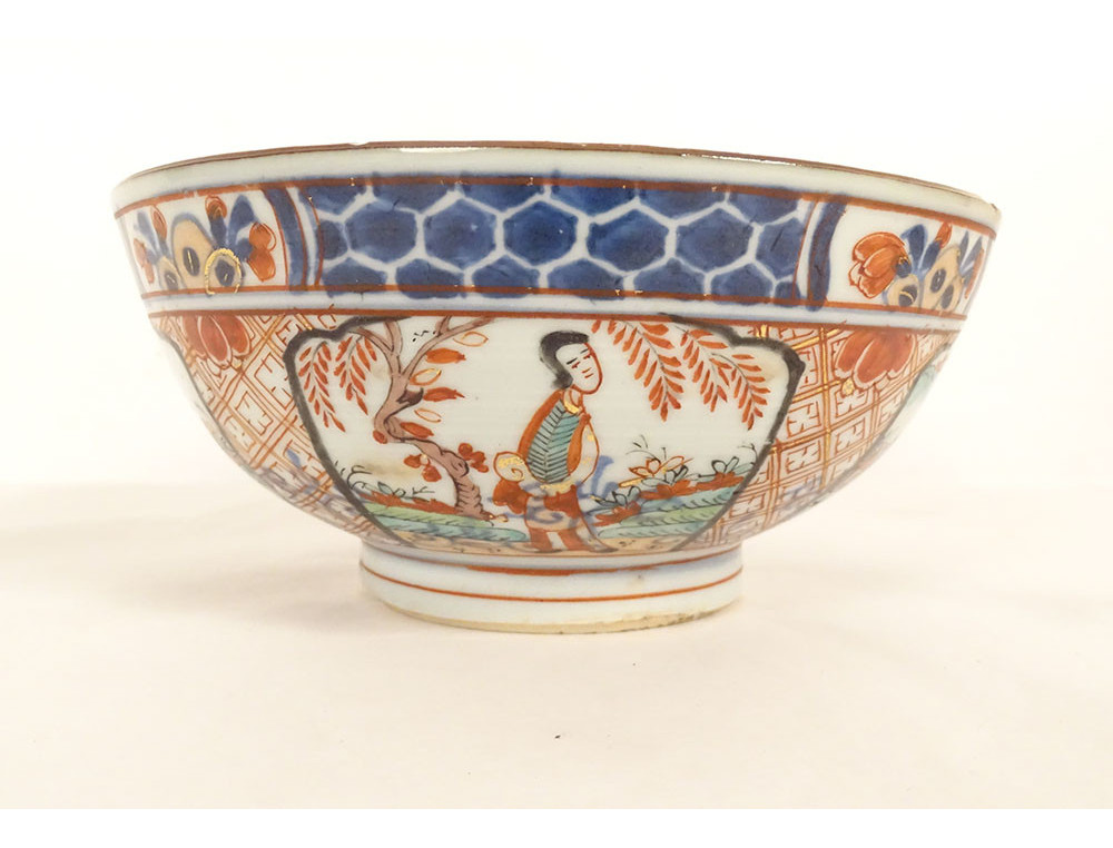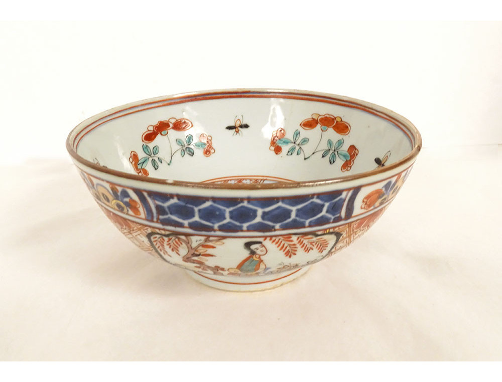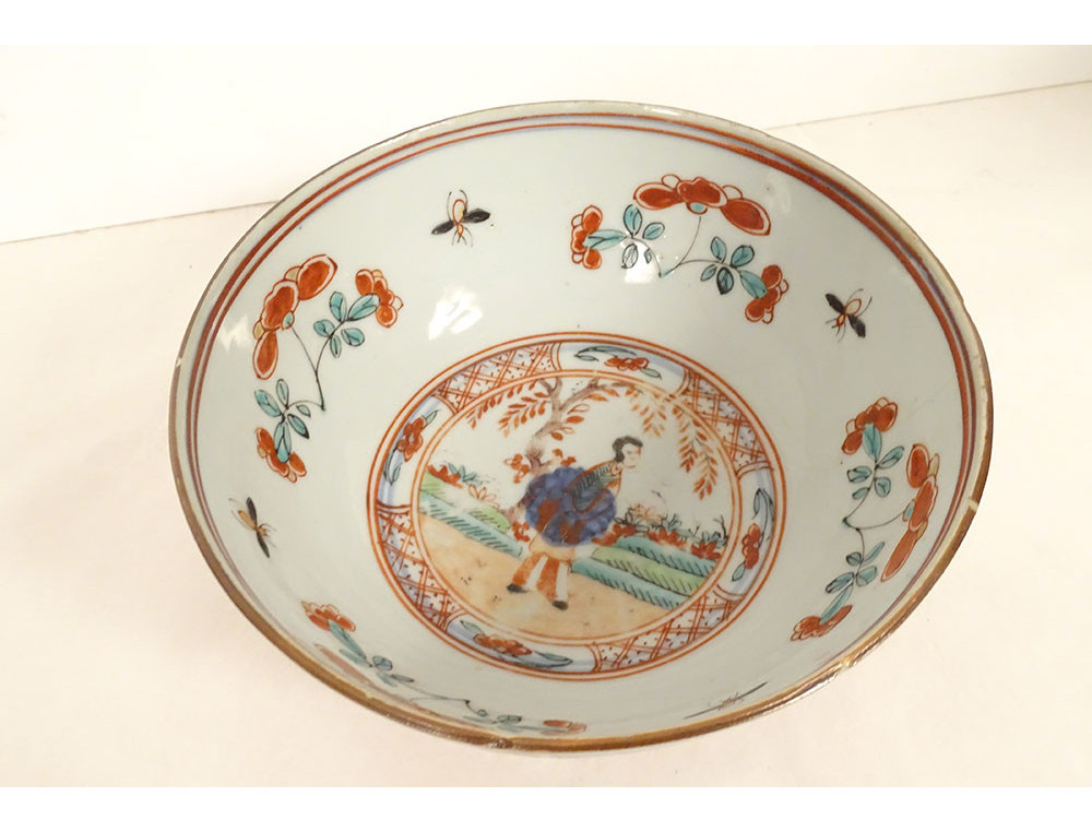 Chinese porcelain bowl from the Dutch East India Company, decorated in the so-called Amsterdam Bont style, depicting Asian figures in flowery landscapes, all surrounded by colorful flowers and insects, as well as stylized motifs.