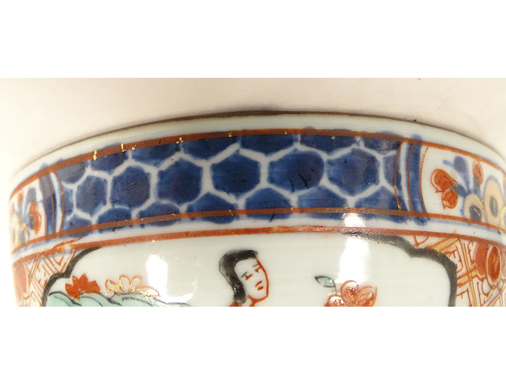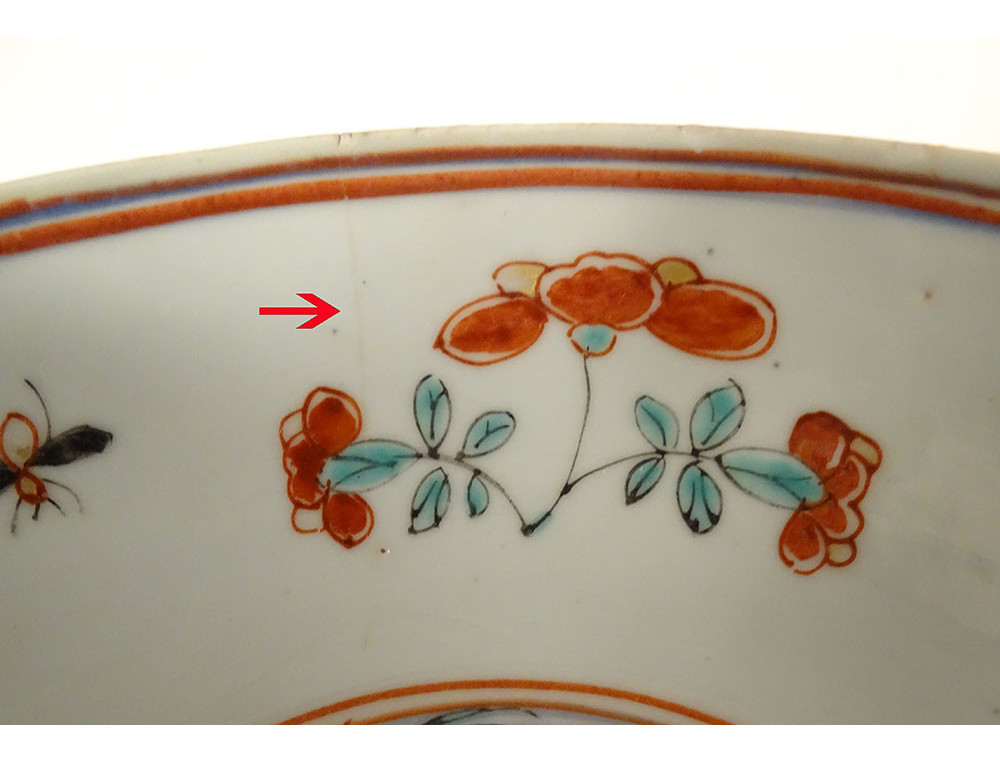 Note: a crack on the edge (see red arrow), an old chip repainted on the edge, some enameling defects, wear and tear of time, see photos.