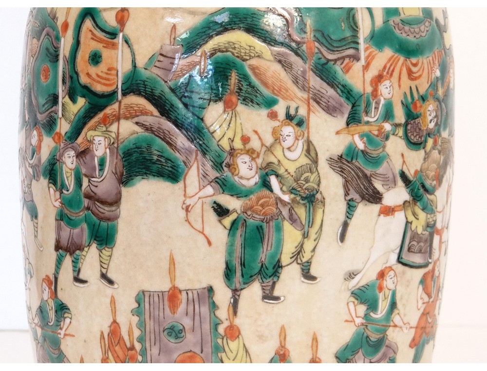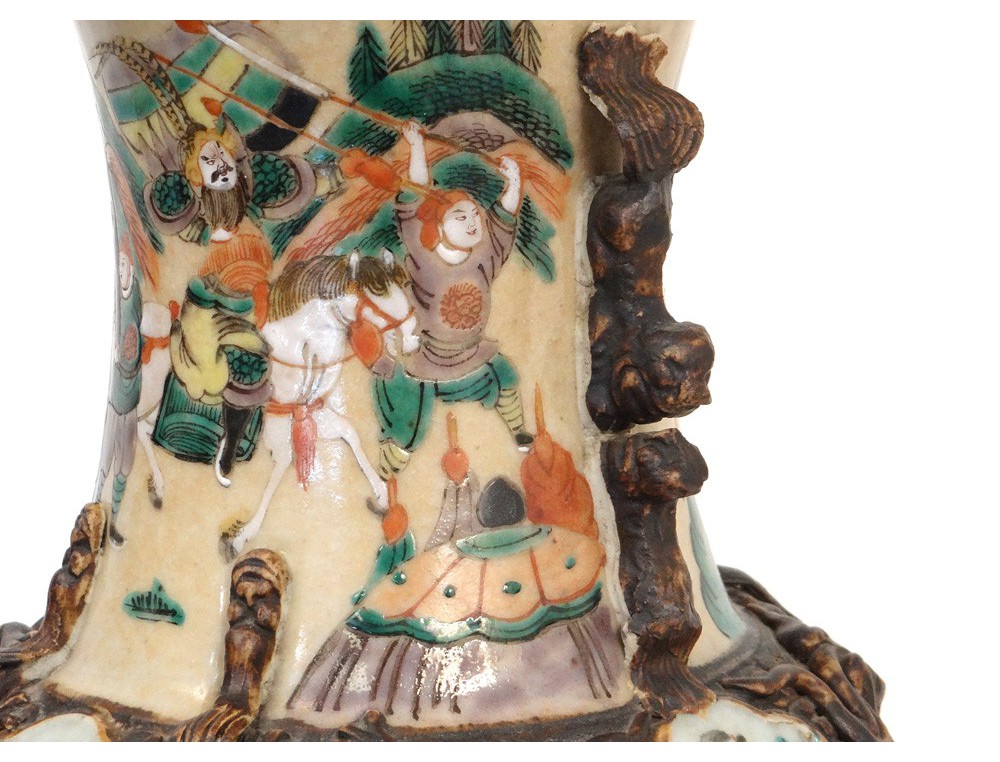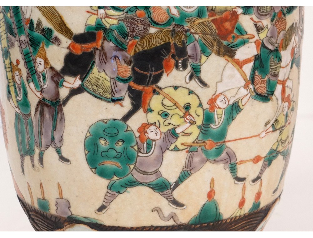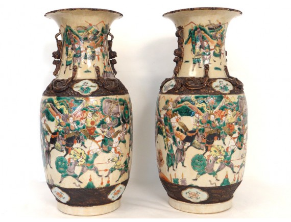 Superb pair of Chinese porcelain vases of Nanking, thoroughly carquelé beige glazed polychrome decoration of many Asian characters, warriors and horsemen at the heart of a battle, the top of the belly and side grips on the collar patterned chimeras , fantastic animals, lizards and lions, signed below, vintage early twentieth century.