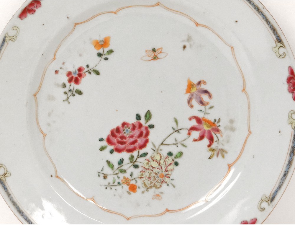 Very nice porcelain dish from the Compagnie des Indes, famille rose, decorated with colorful flowers (chrysanthemums and lotus) and a small insect (a bee), from the 18th century.