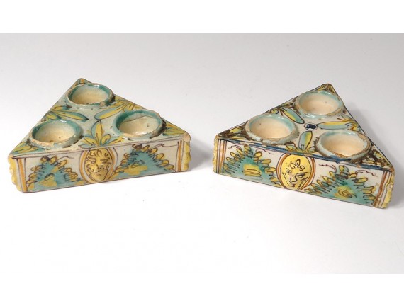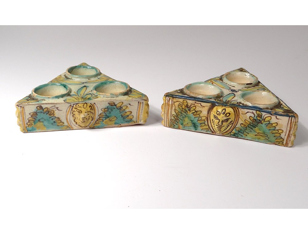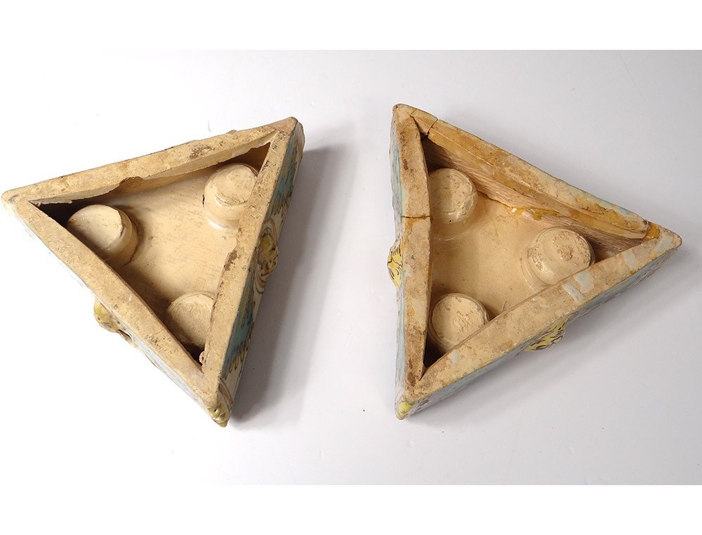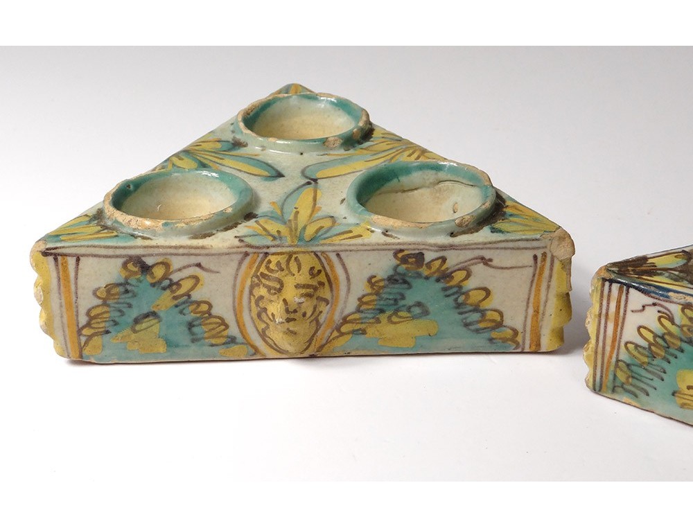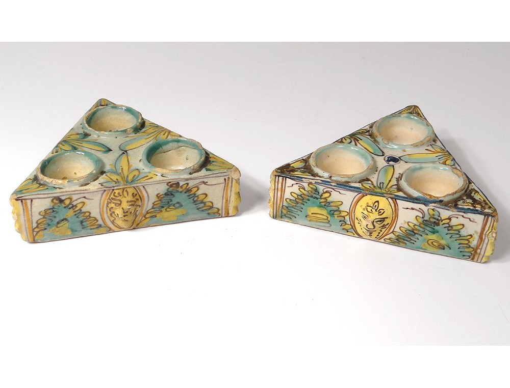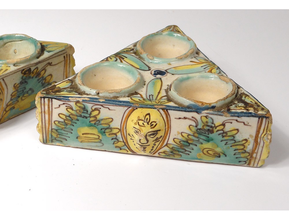 Pair of Spice containers triangular Spanish polychrome faience of Talavera * decorated with stylized foliage and masks on the sides, vintage eighteenth century.