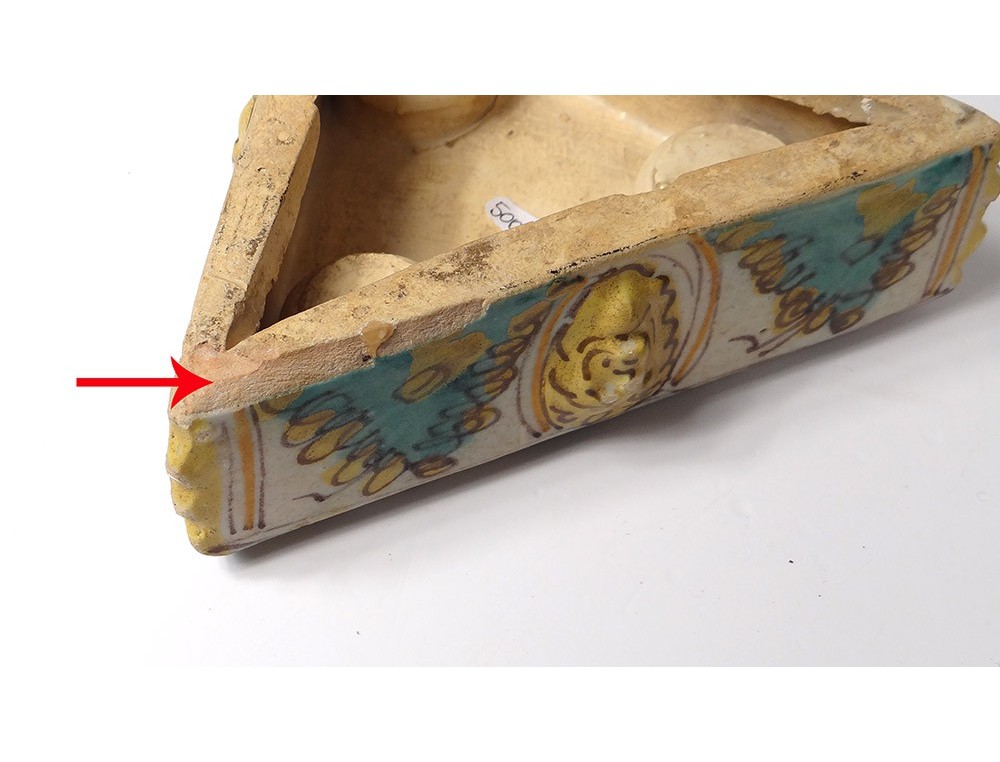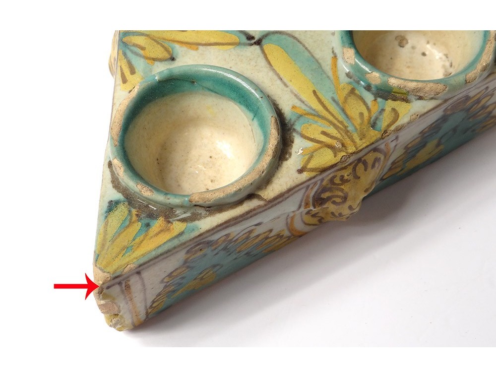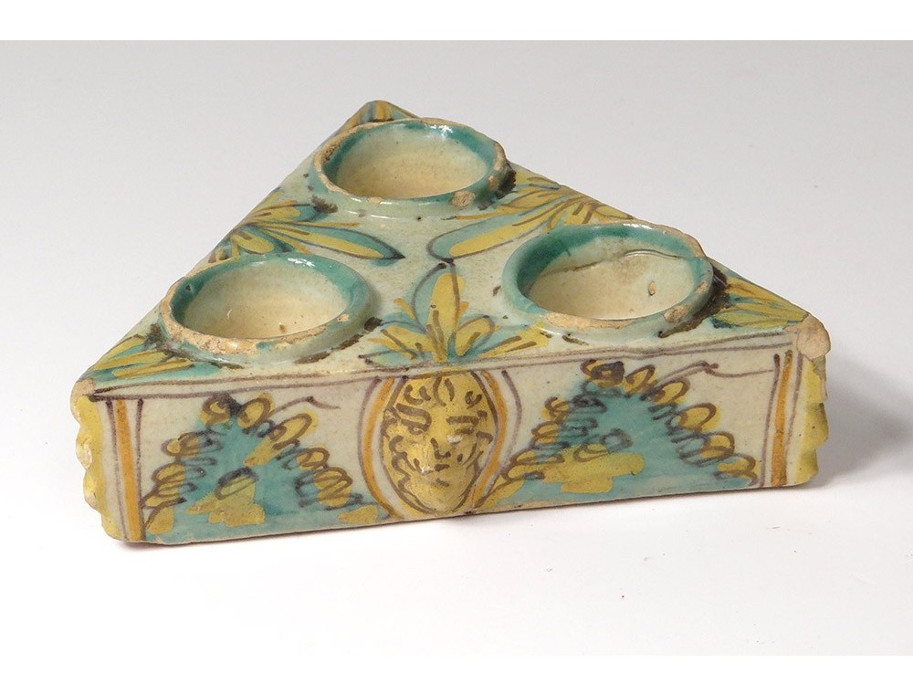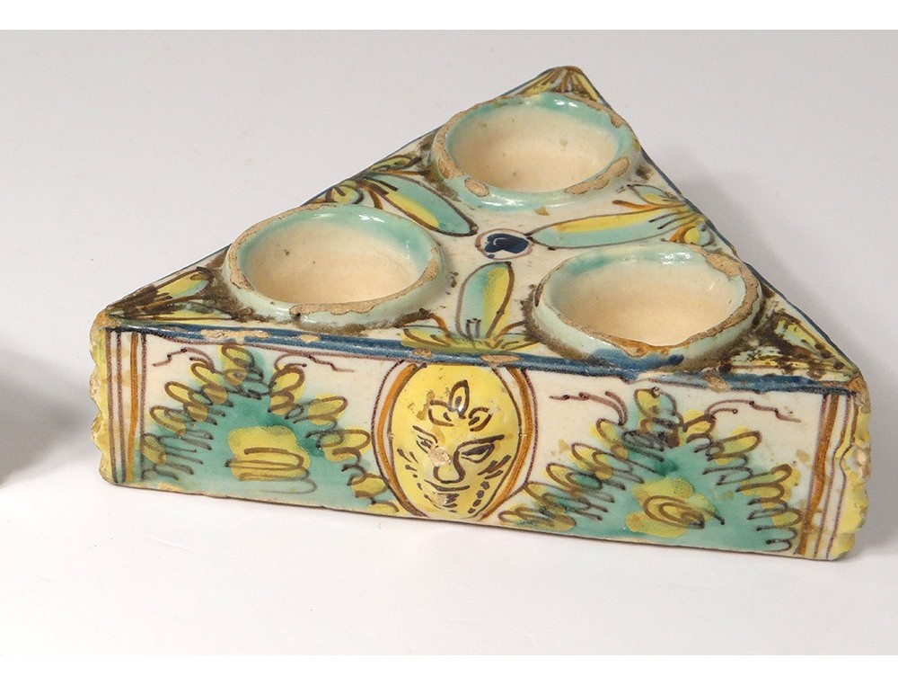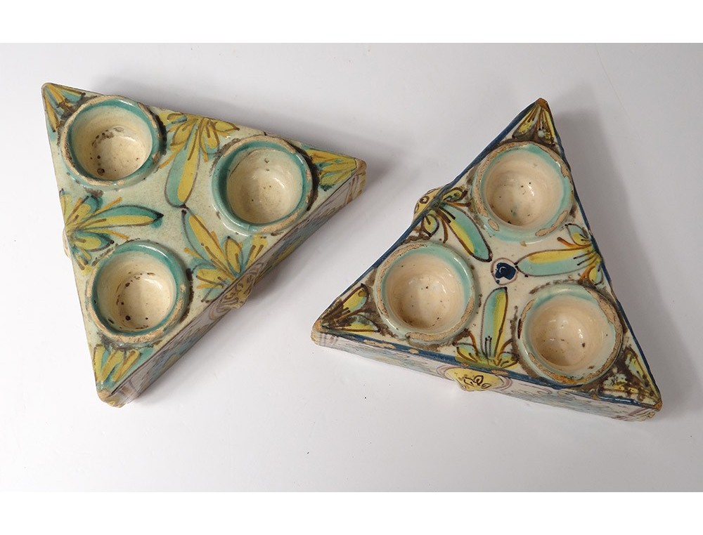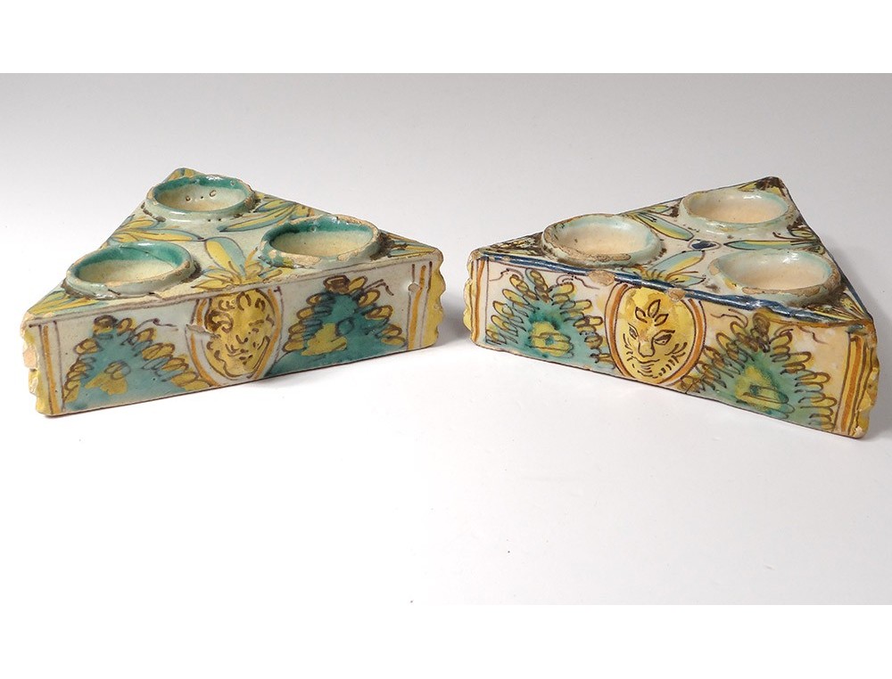 Pair of Spice containers triangular Spanish polychrome faience of Talavera * decorated with stylized foliage and masks on the sides, vintage eighteenth century.