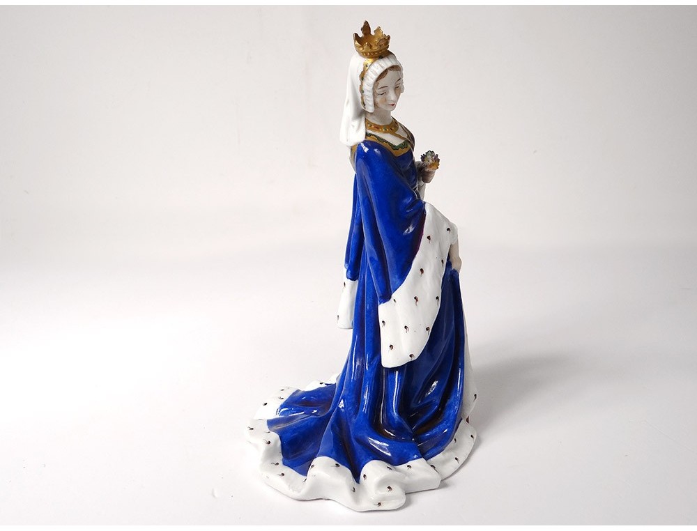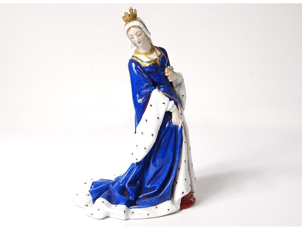 German porcelain statuette from the Manufacture of Passau (Bavaria) depicting a Queen of the Middle Ages wearing her crown and a heavy velvet dress, holding a small bouquet of flowers, vintage late nineteenth century.