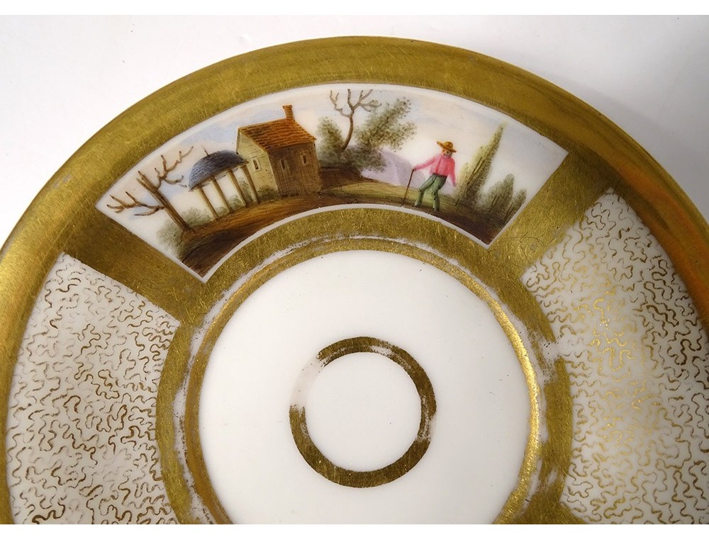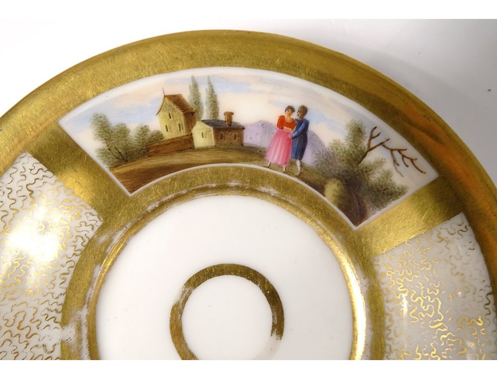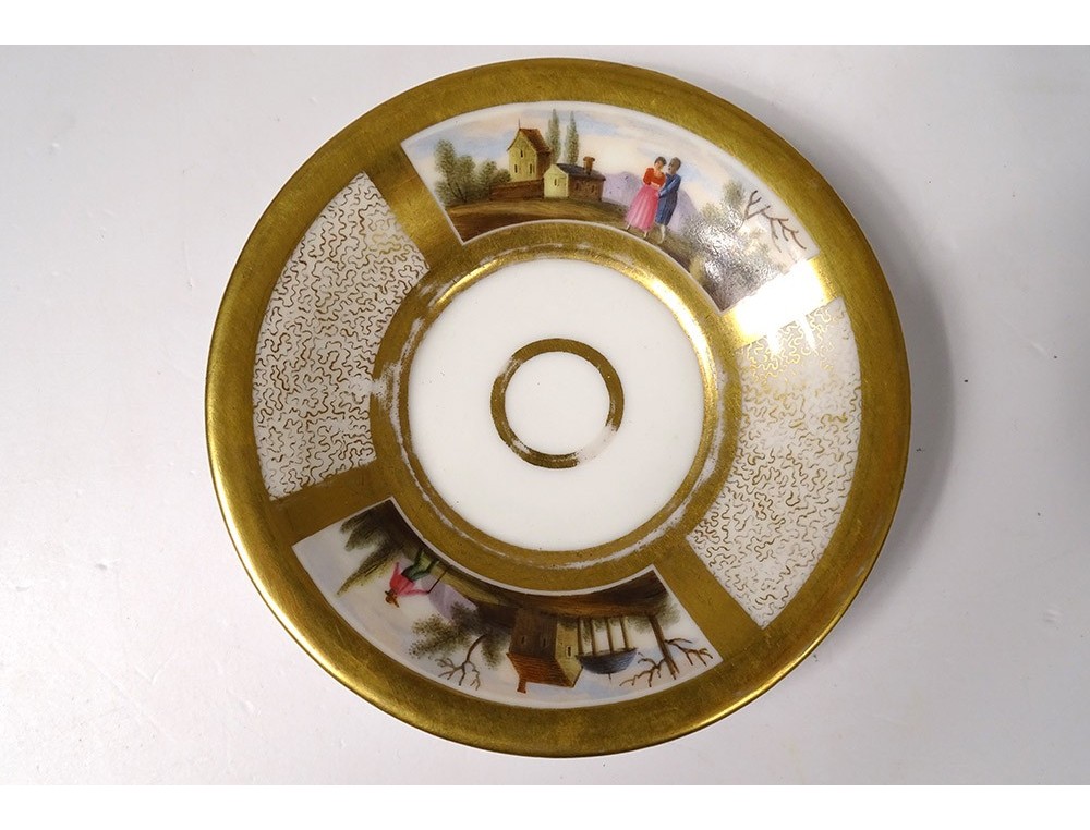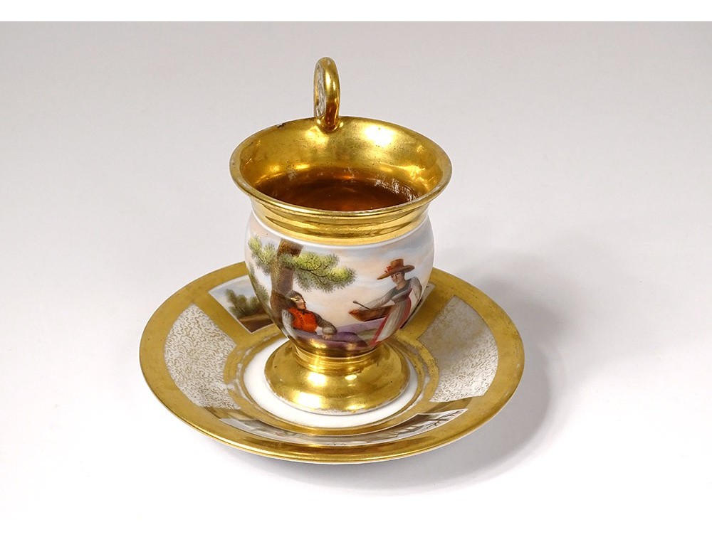 Cup and saucer in polychrome Paris porcelain enhanced with gilding, decorated with landscapes and characters, from the 19th century Restoration period.