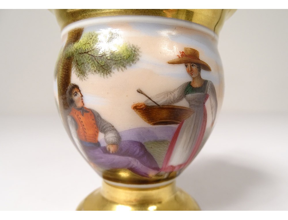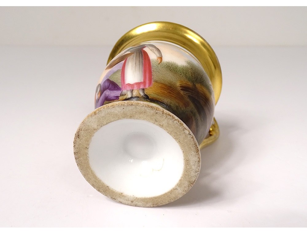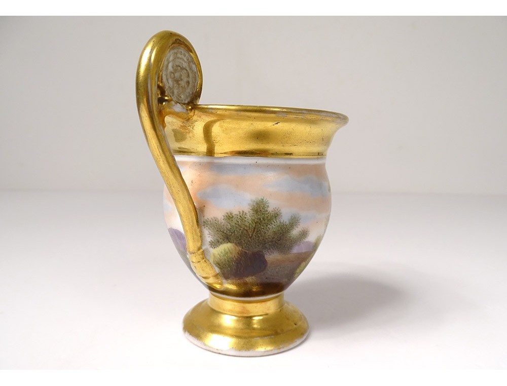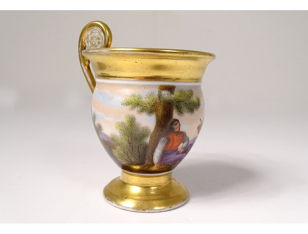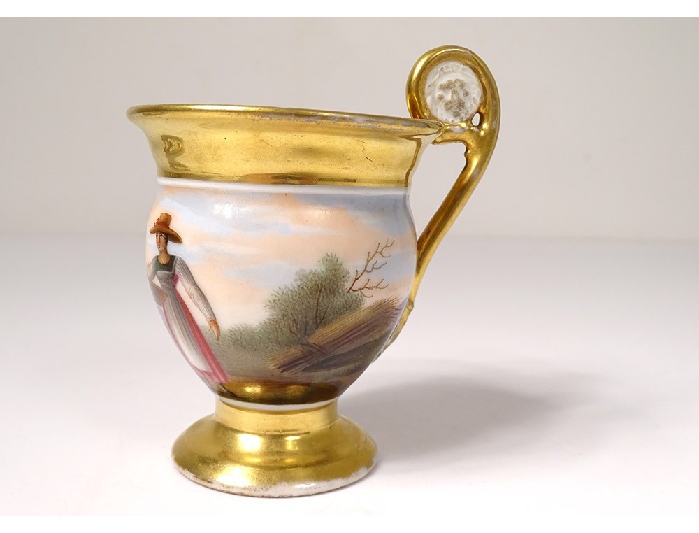 Cup and saucer in polychrome Paris porcelain enhanced with gilding, decorated with landscapes and characters, from the 19th century Restoration period.