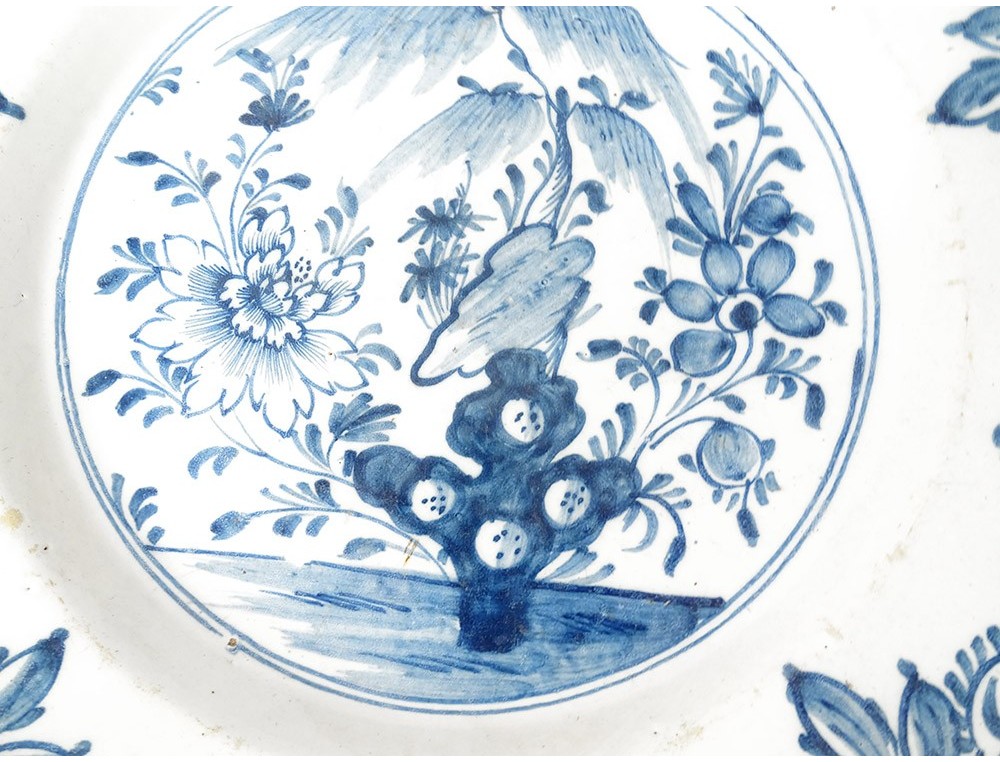 Delft earthenware dish, blue Japanese decor, representing flowers, XIXth century.