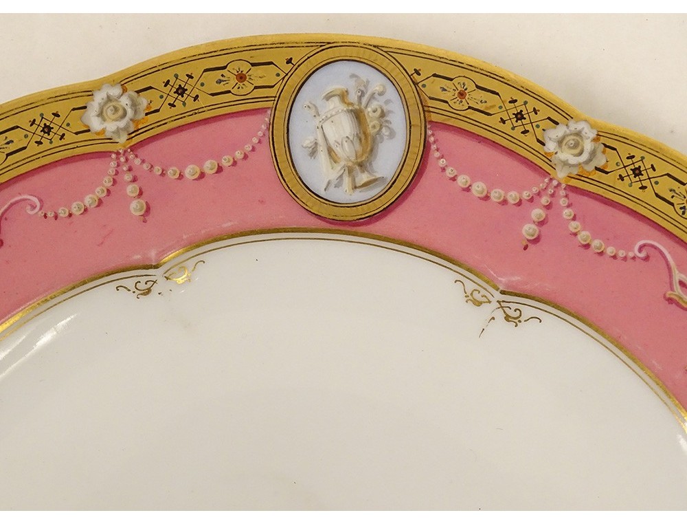 Decorative plate with lobed edge in polychrome Paris porcelain signed Le Rosey* XI Rue de la Paix, decorated with a crowned monogram in the background, marli richly decorated with medallions with musical instruments or vases, connected by fine garlands, border enhanced with gilding, from the second half of the 19th century.