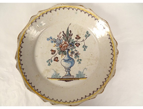 Earthenware plate from Nevers, with scalloped edges, centrally decorated with a large baluster vase decorated with flowers, in a garden, from the 18th century.