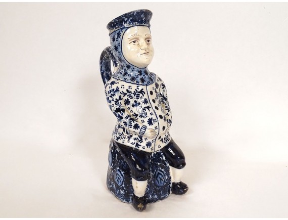 Anthropomorphic pitcher Jacquot Delft earthenware white blue man flowers 19th century