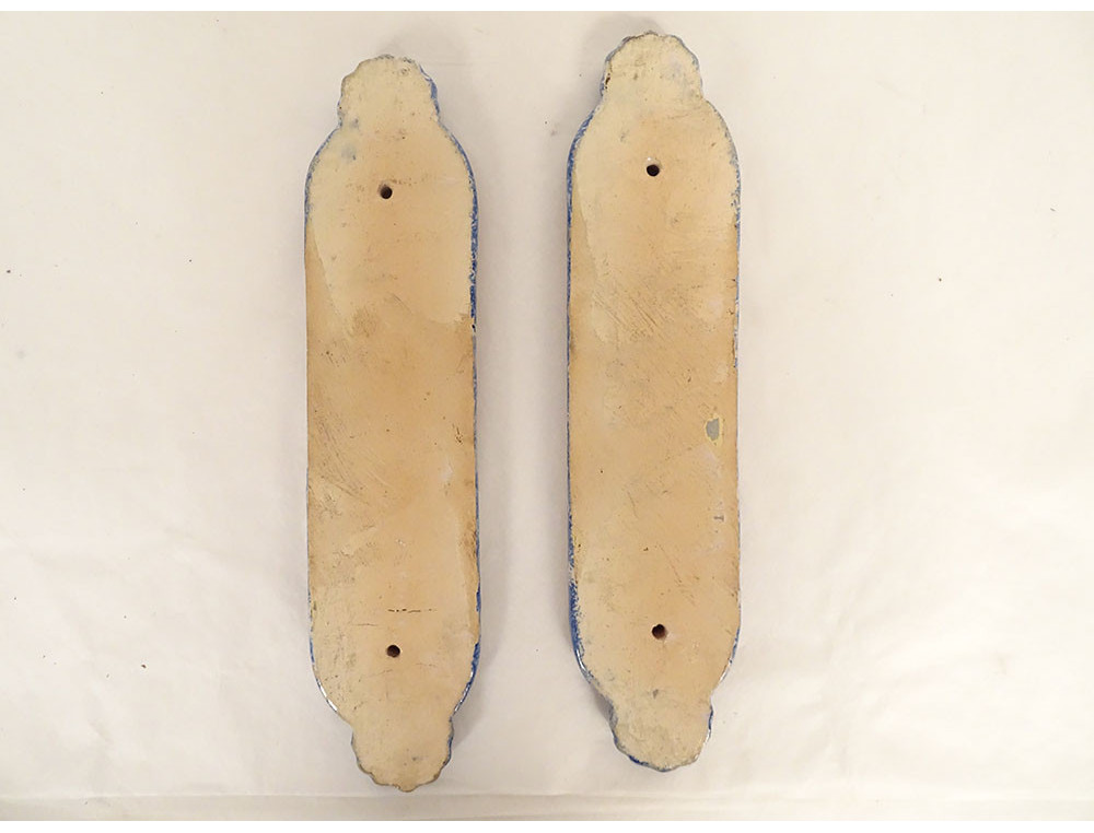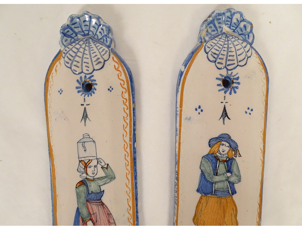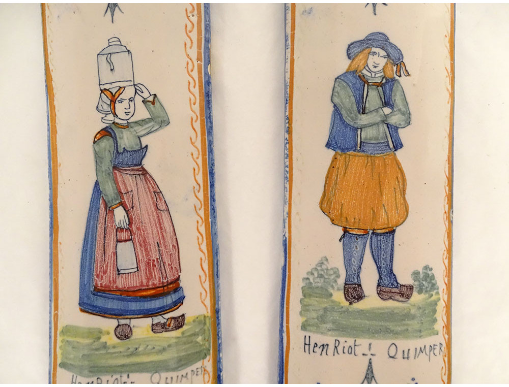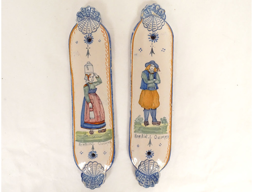 Pair of Quimper earthenware cleaning plates signed Henriot, decorated with a Breton woman holding a jug of milk on her head and a Breton man with his arms crossed, stylized shells at the bottom and top of the plate, from the late 19th-early 20th centuries.