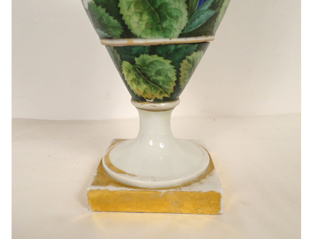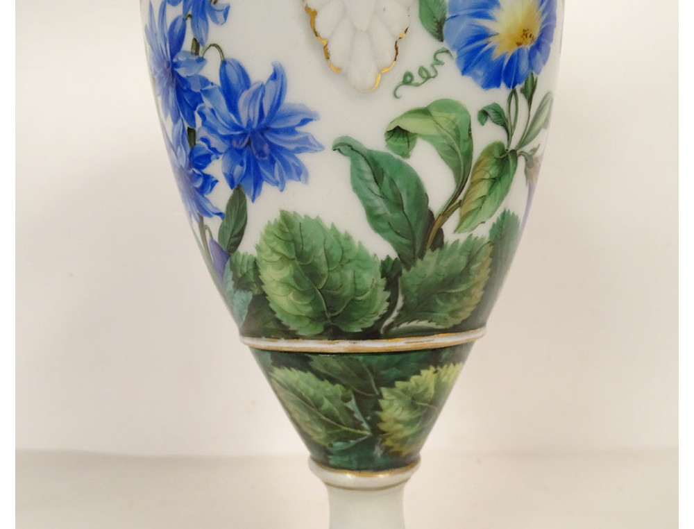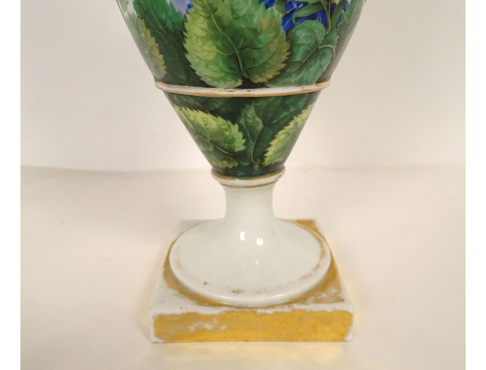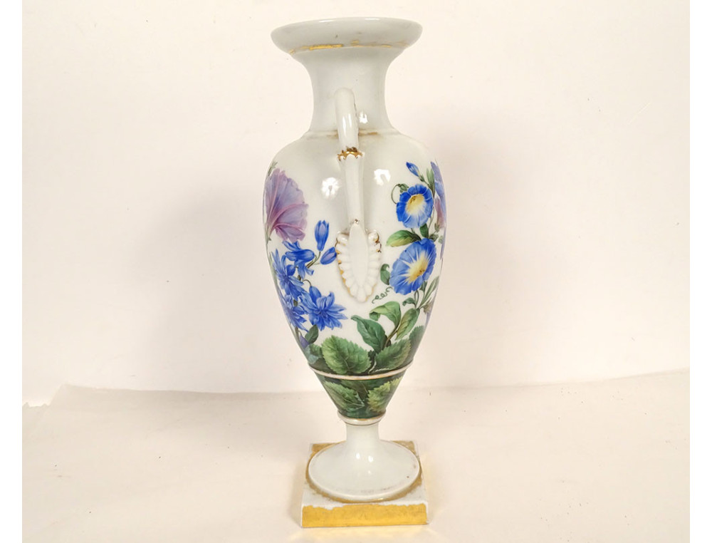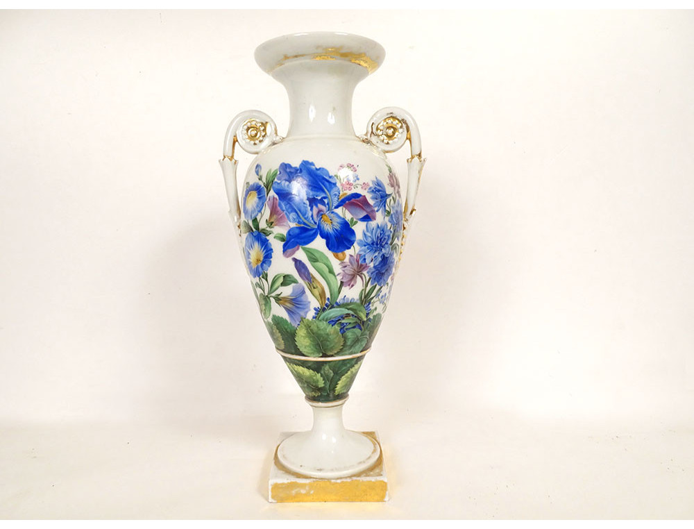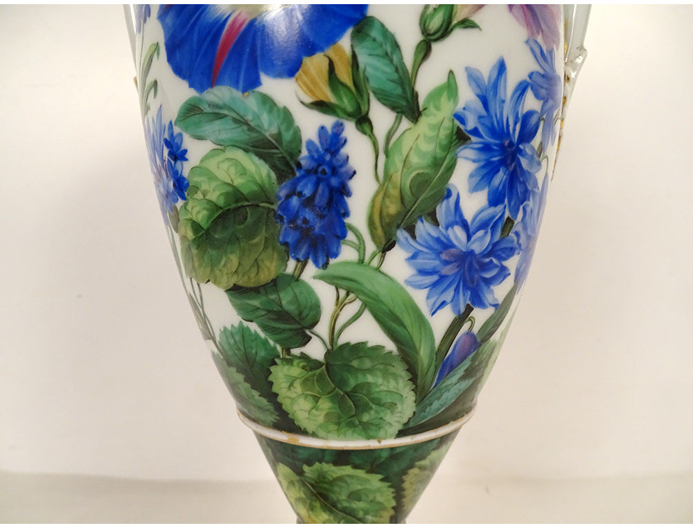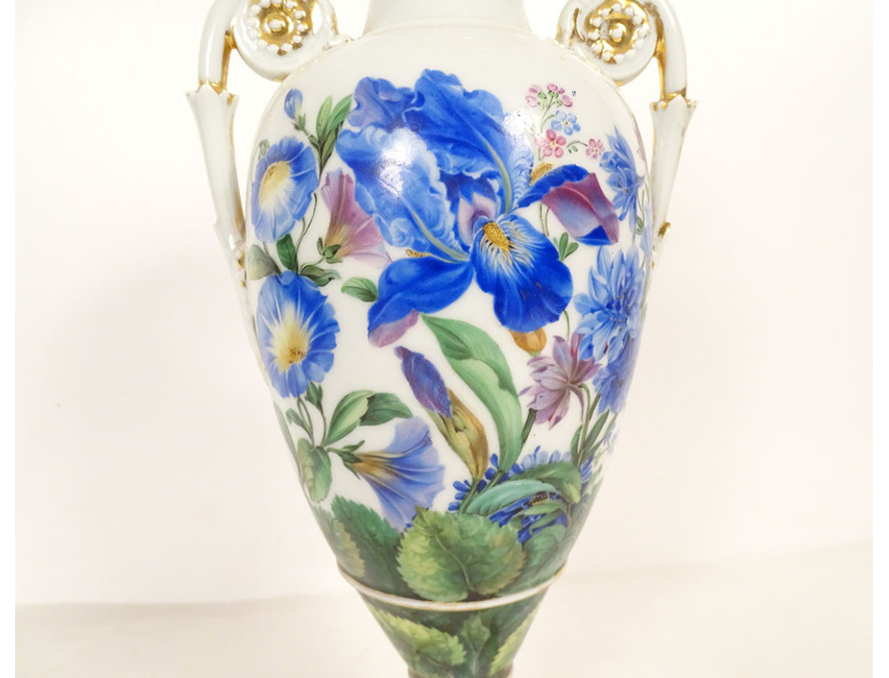 Amphora-shaped vase in German Meissen porcelain, with polychrome decoration enhanced with gilding of numerous blue-violet flowers among green foliage: notably blue irises (symbol of confidence and hope), cornflowers (pure and delicate feelings) and bindweed flowers (symbol of Love), scrolled handles, from the second half of the 19th century.