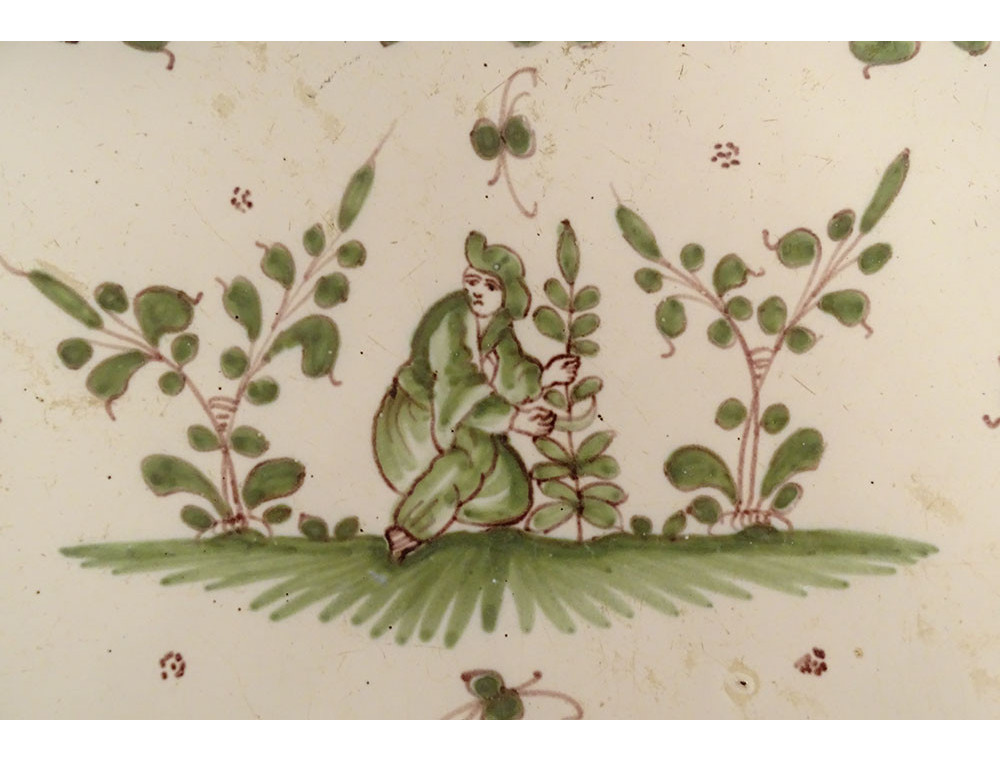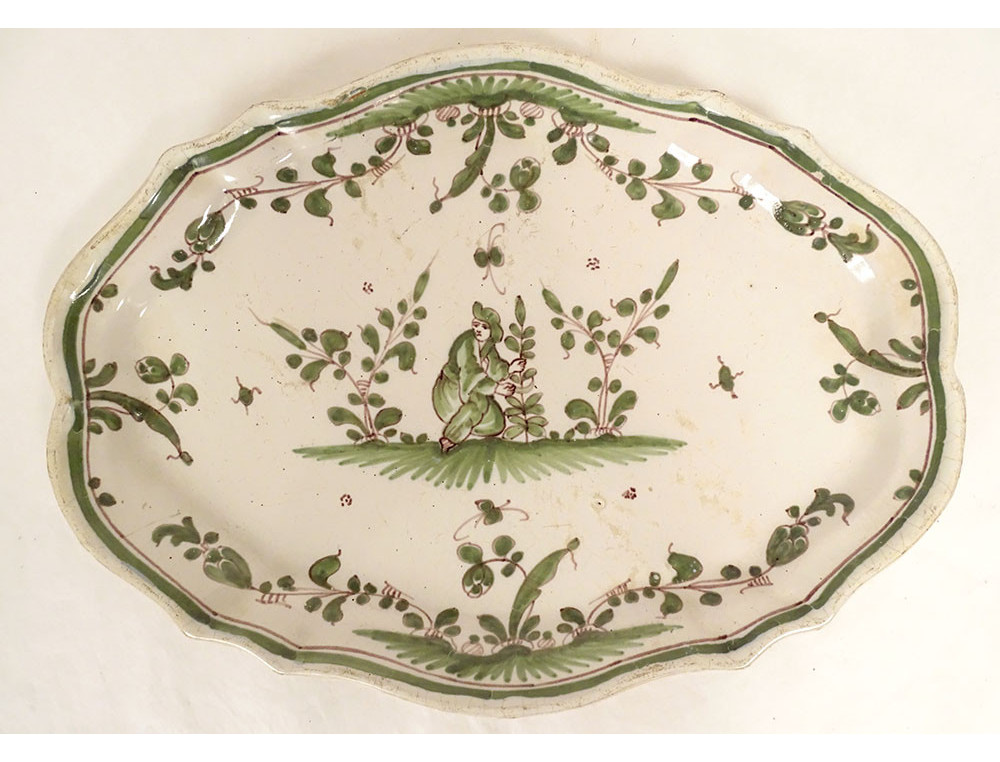 Oval earthenware dish from Moustiers with a figure, flowers, and foliage, 18th century