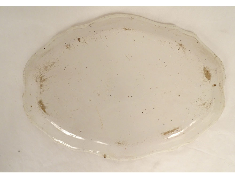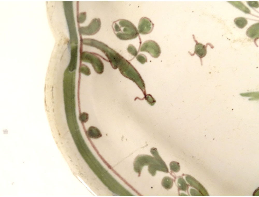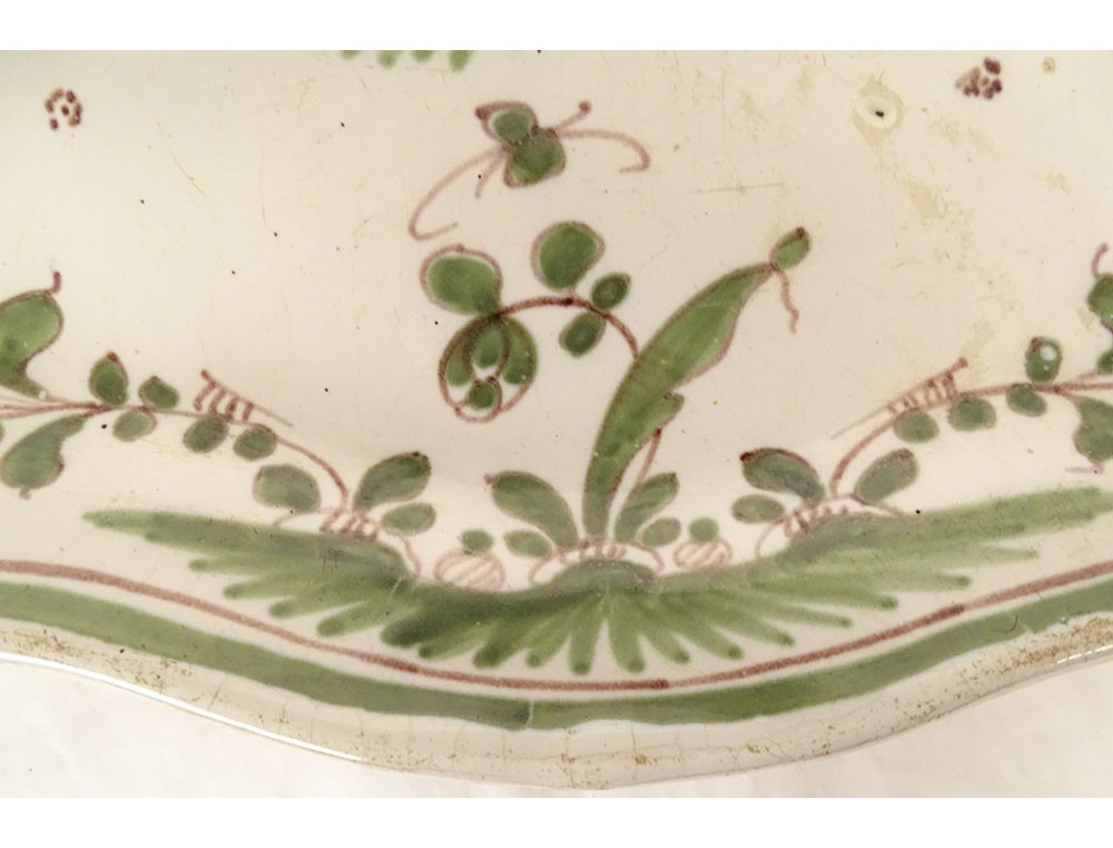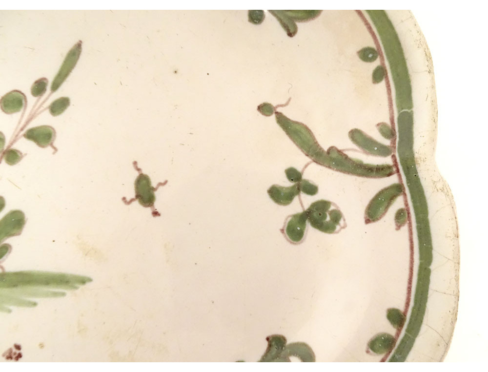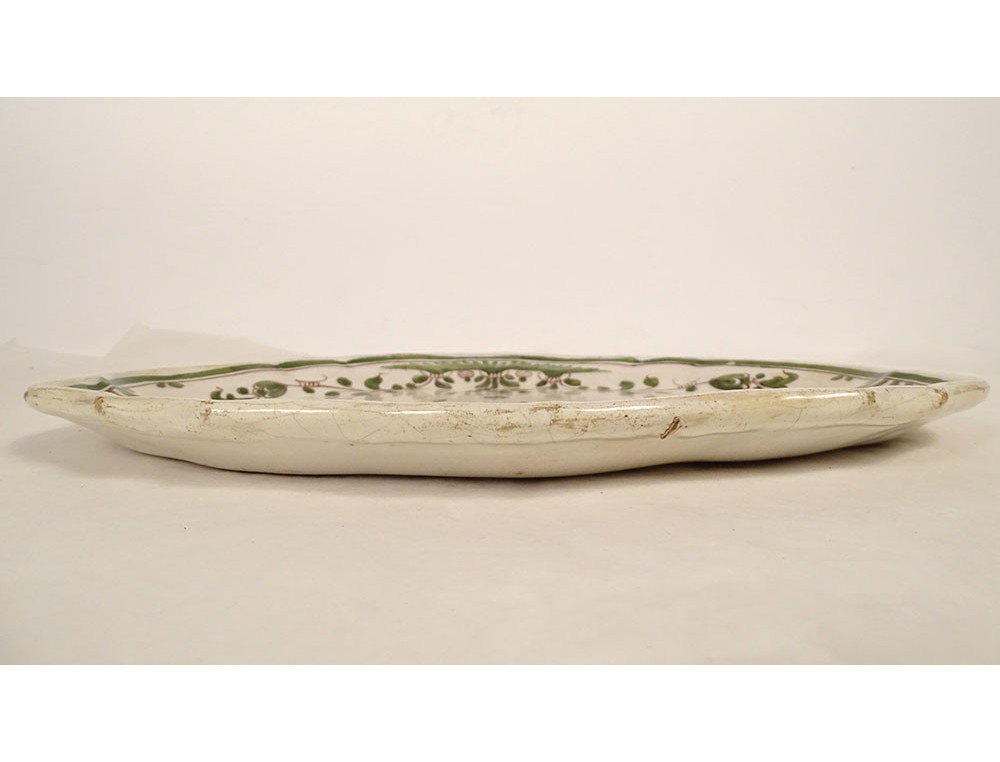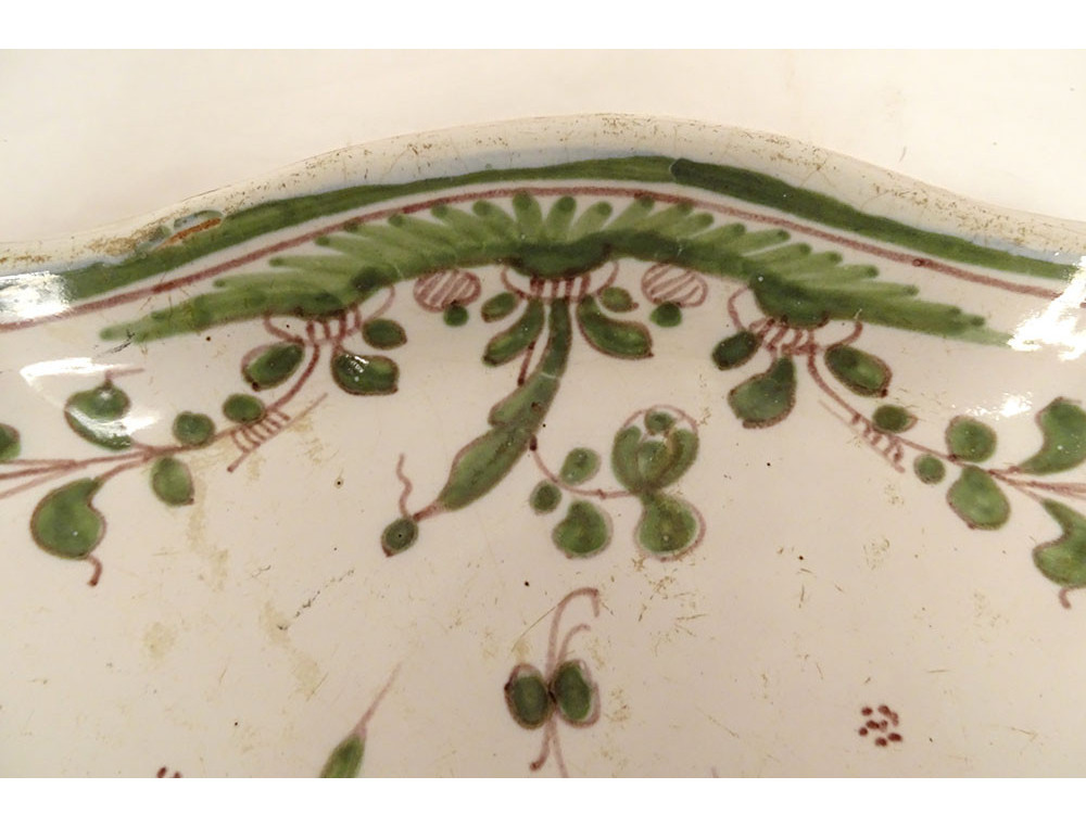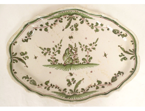 Oval scalloped earthenware dish from Moustiers, decorated in green monochrome with a central figure among flowers, all surrounded by insects and plant motifs, from the 18th century.