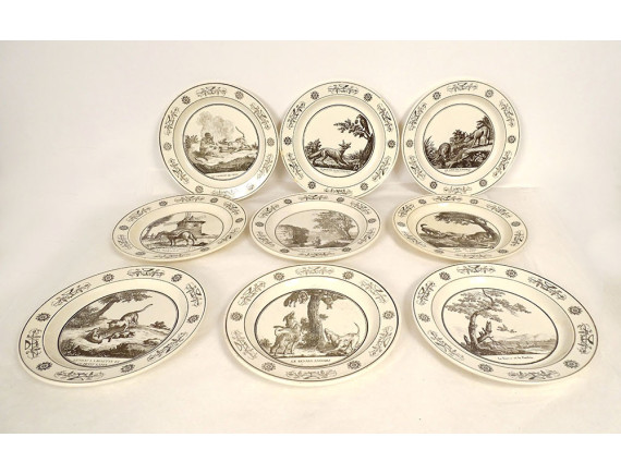 Set of 9 so-called talking dessert plates, in Creil Montereau earthenware, decorated with scenes from La Fontaine's Fables, from the 19th century.