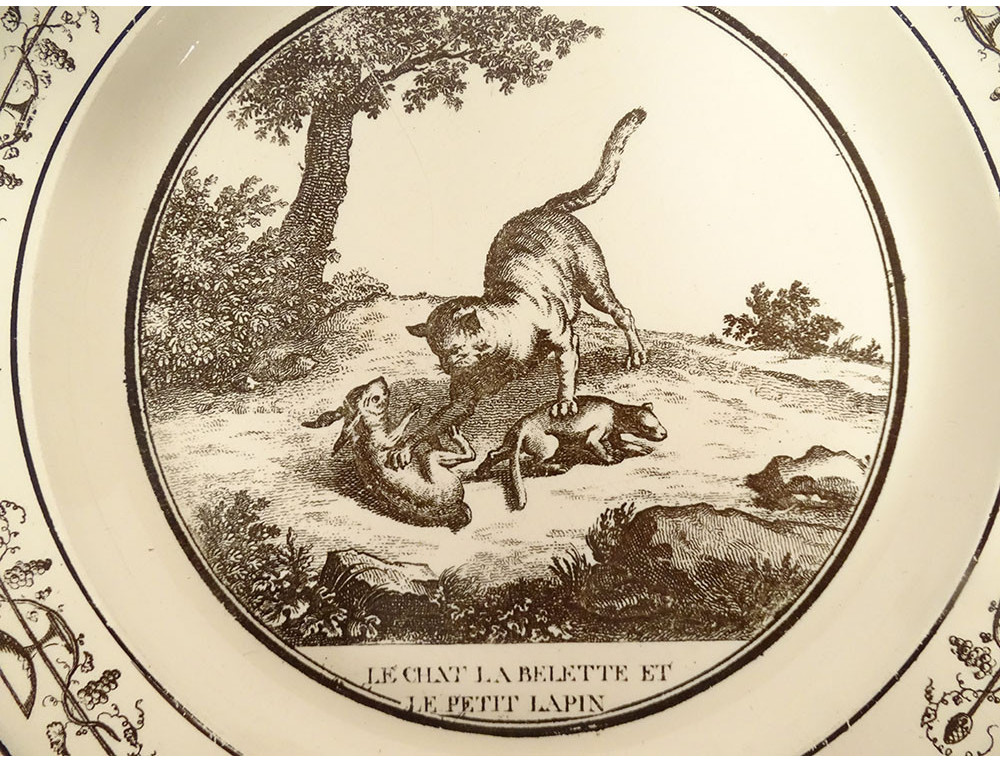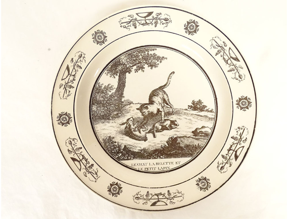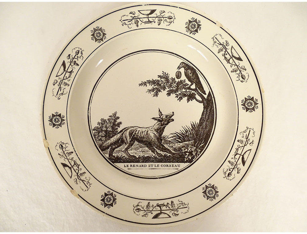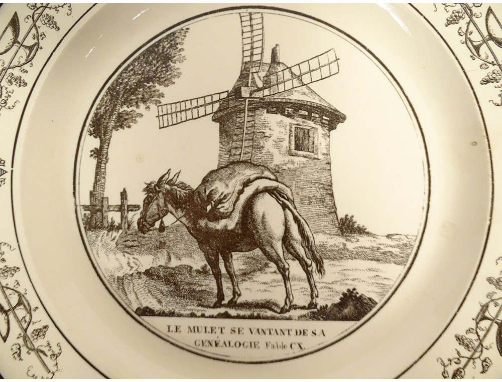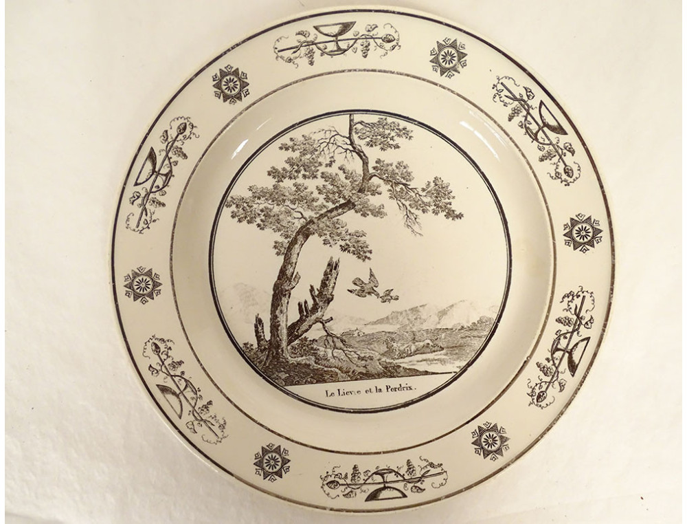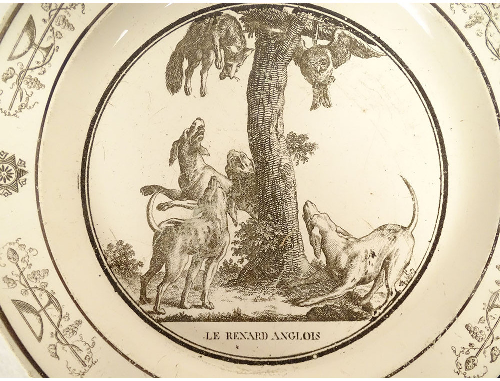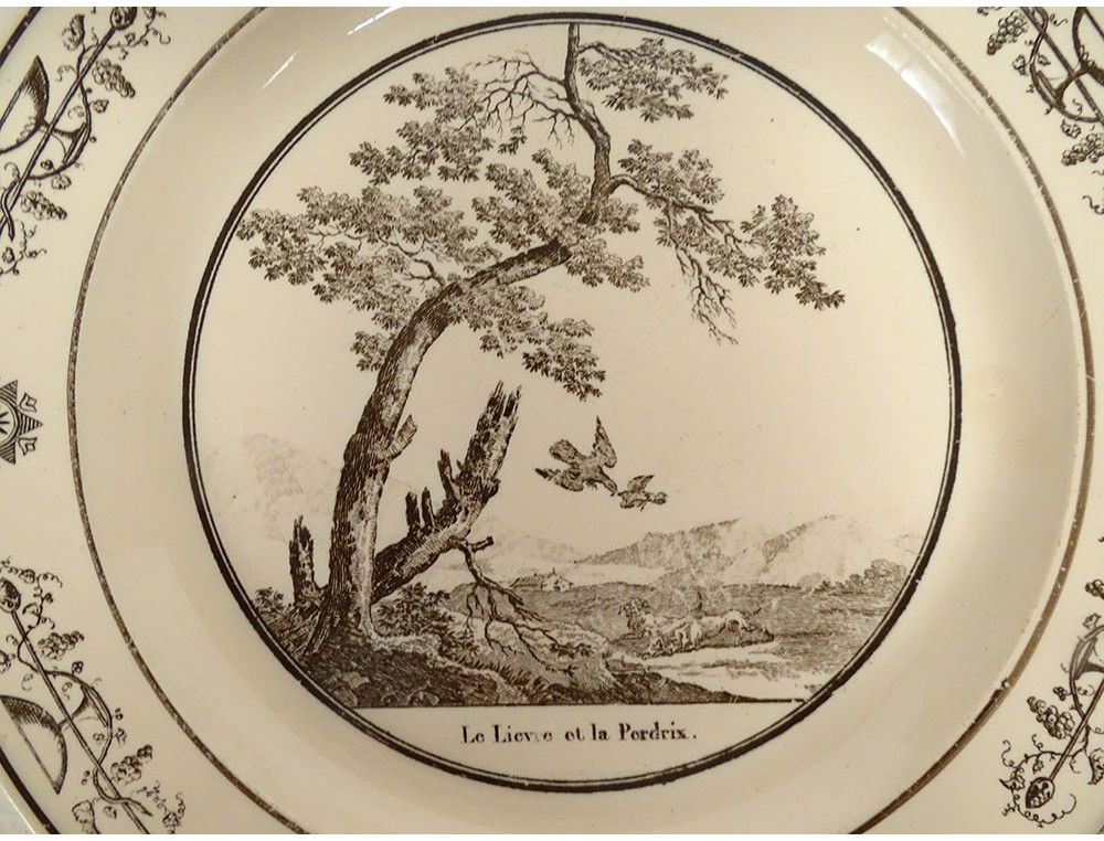 9 talking dessert plates, Creil Montereau earthenware, Fables of Fontaine, 19th century