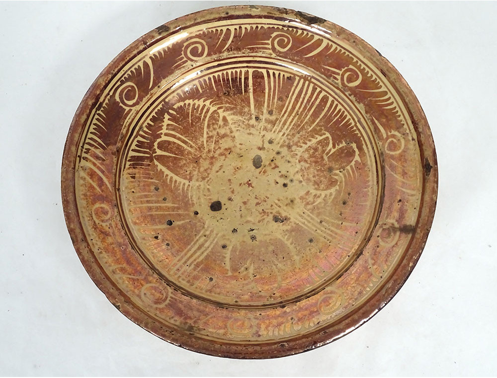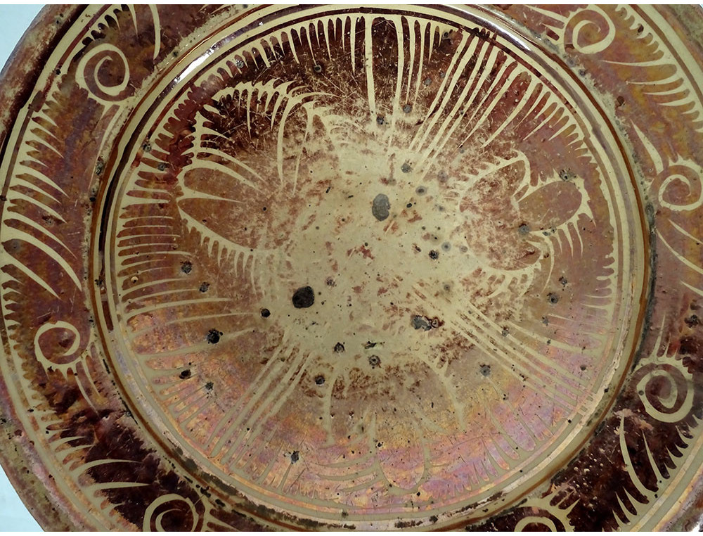 Deep dish of Hispano-Moresque earthenware from Manises, Spain, with foliage reflection, 17th century