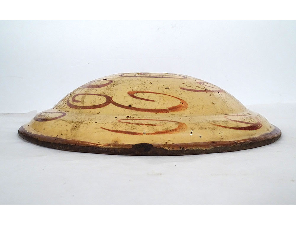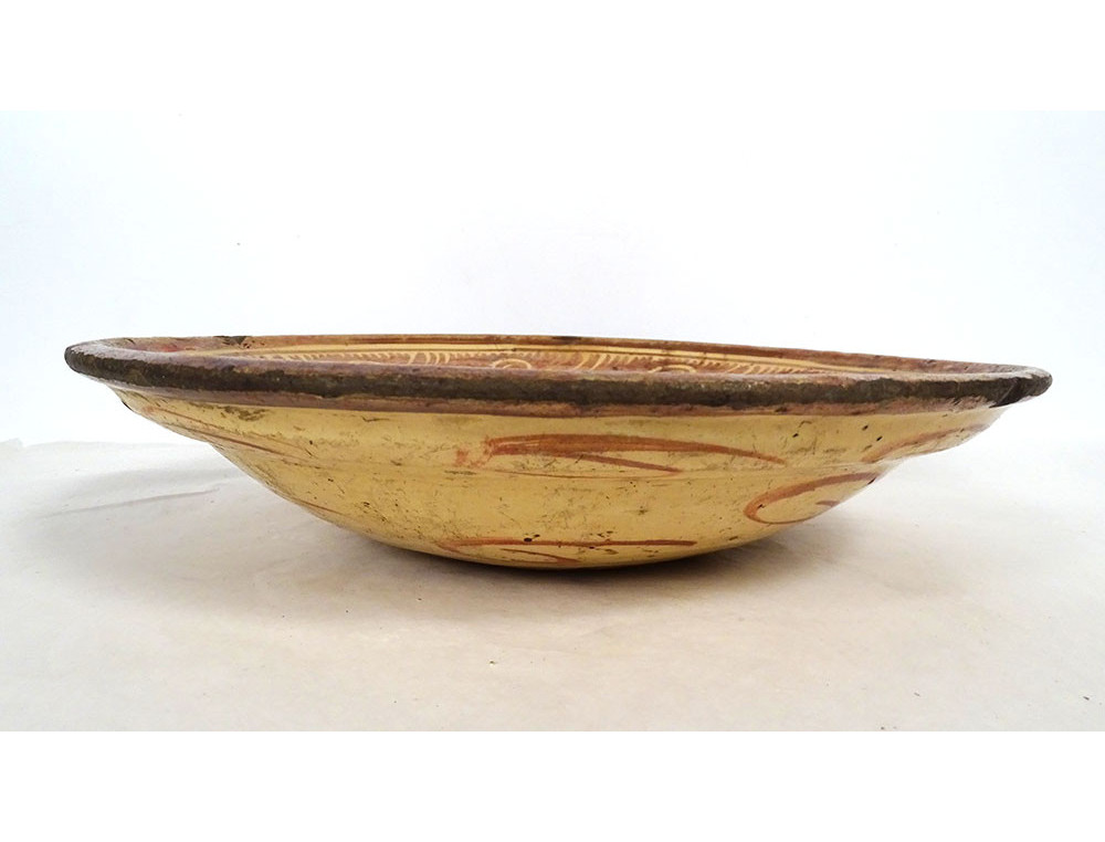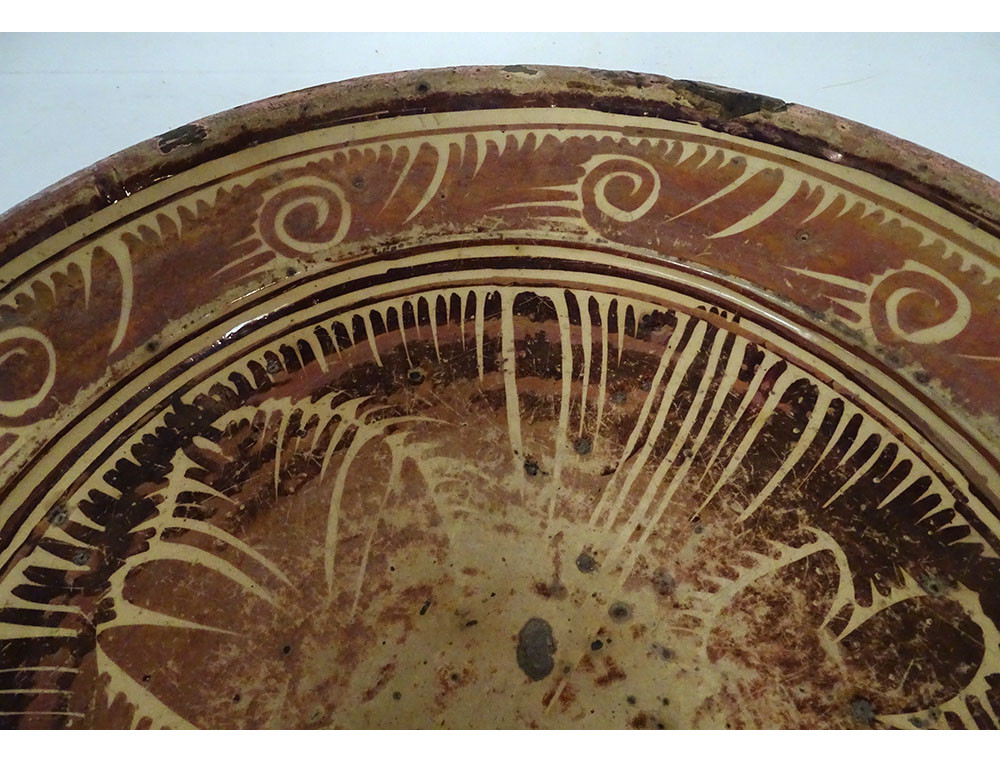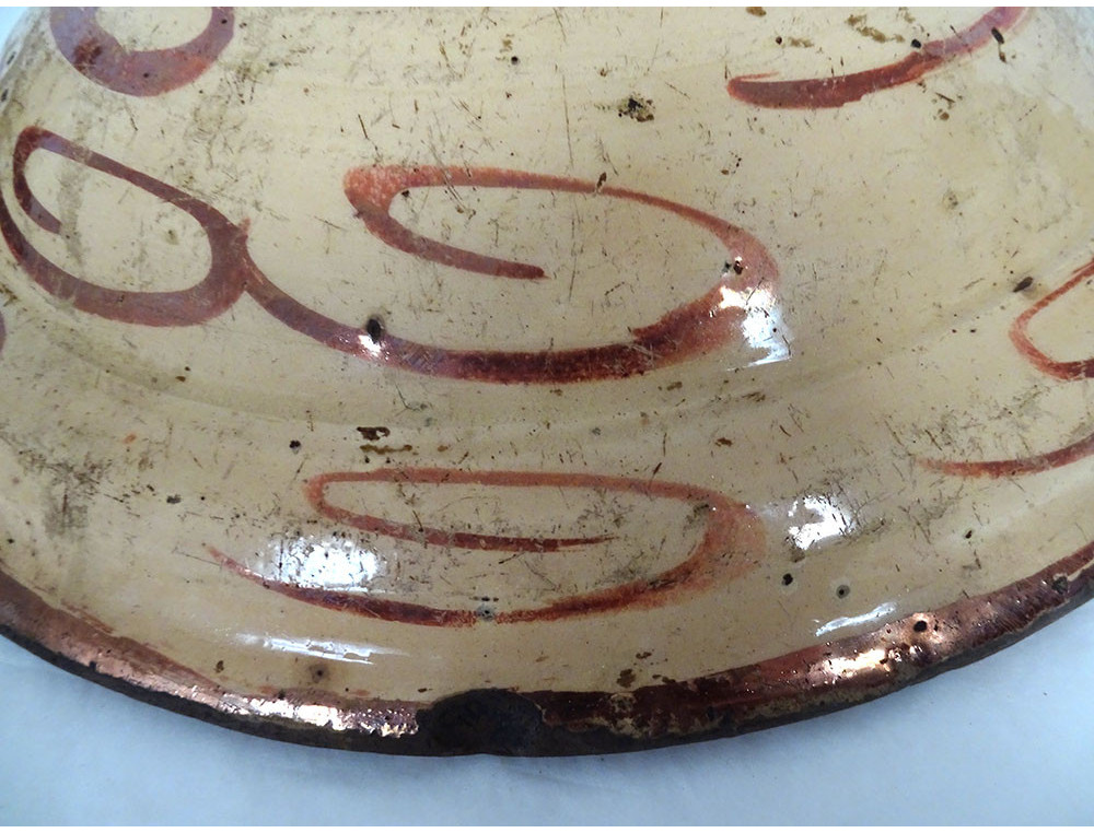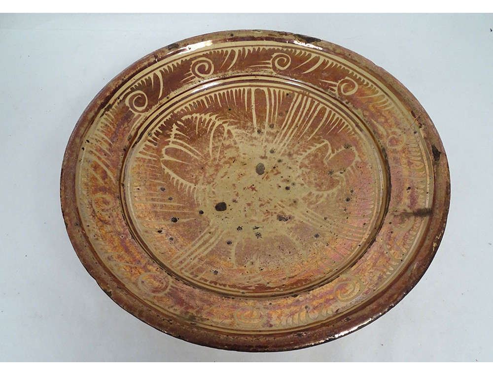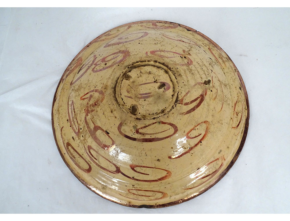 Large deep dish in Hispano-Moorish earthenware from Manises (Valencia), decorated with stylized foliage in the centre and curved lines on the border, glossy pink glaze with metallic reflections, from Spain (province of Valencia) dating from the 17th century.