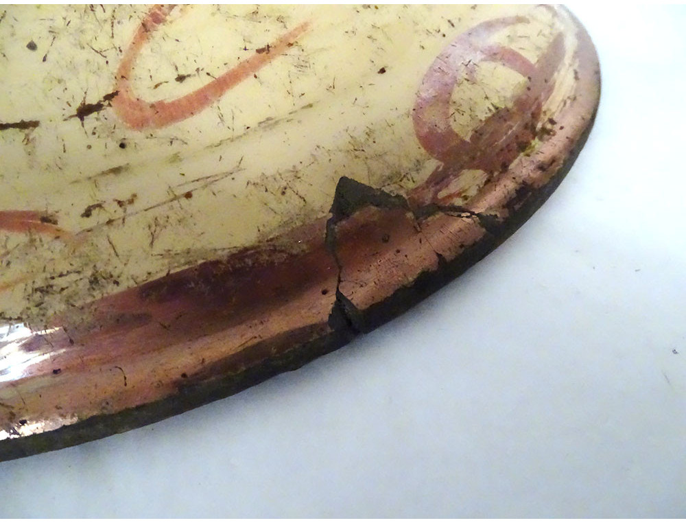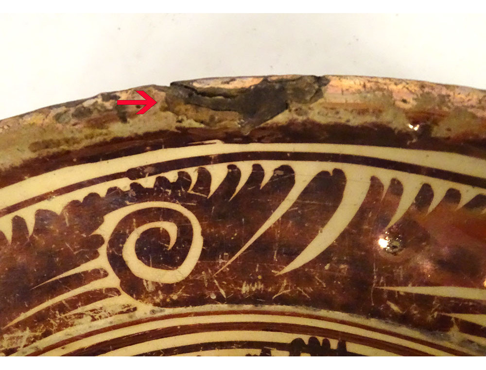 Note: a chip and visible restoration on both sides (see red arrow), a few other chips on the edge, wear to the decorations in the background, see photos.