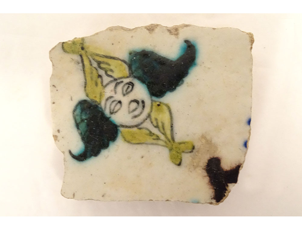 Rare fragment of Turkish-Ottoman faience tile, decorated with a cherub's or seraph's head, from the Sivas region of Turkey, with an old label from the famous Muslim Art antique shop of Joseph Soustiel*, at 146 Bd Haussmann Paris 8, private collection, from the early 17th century.