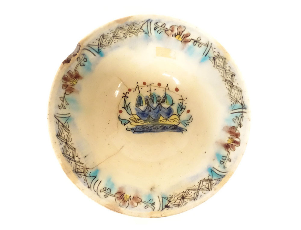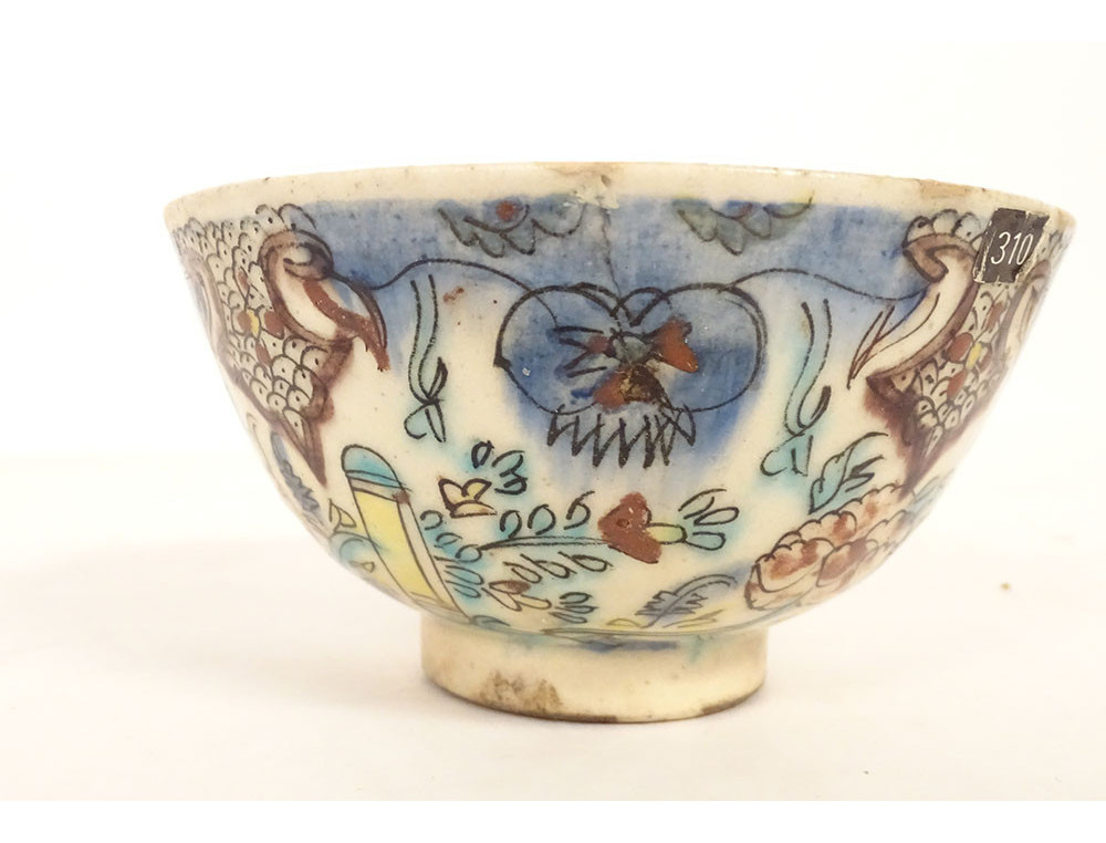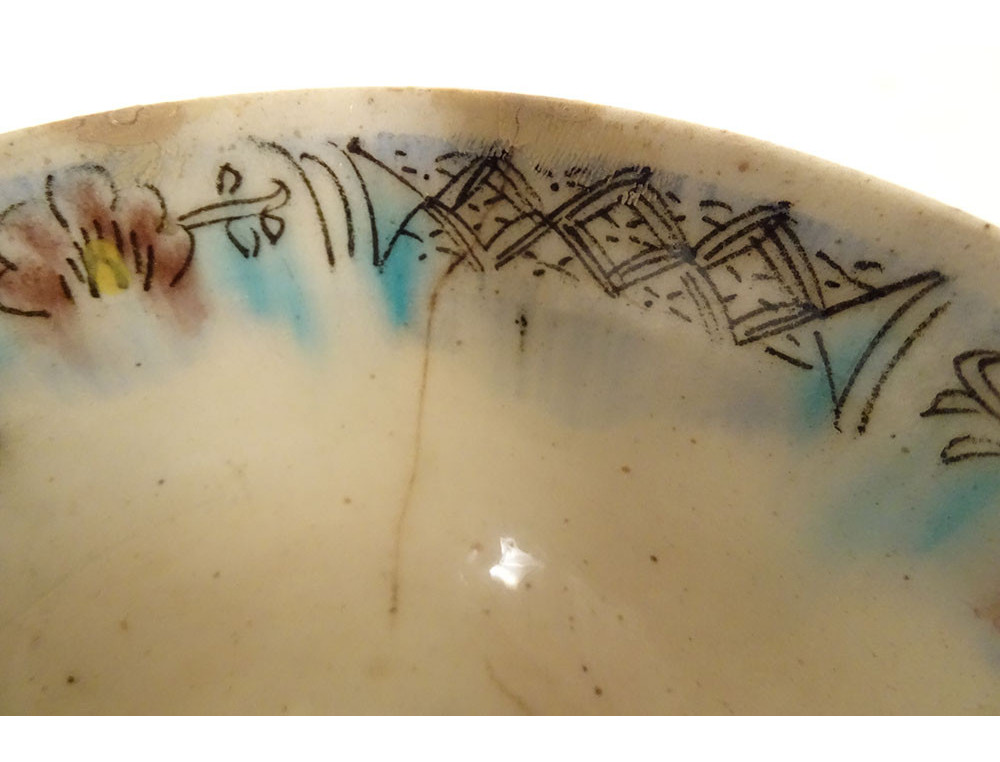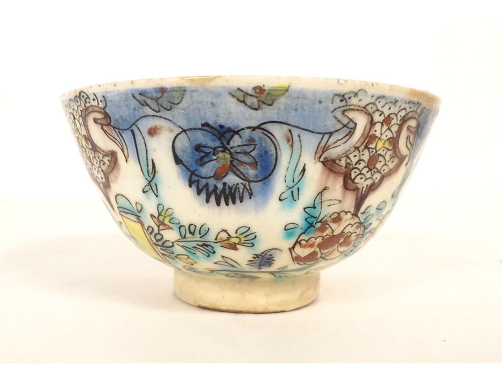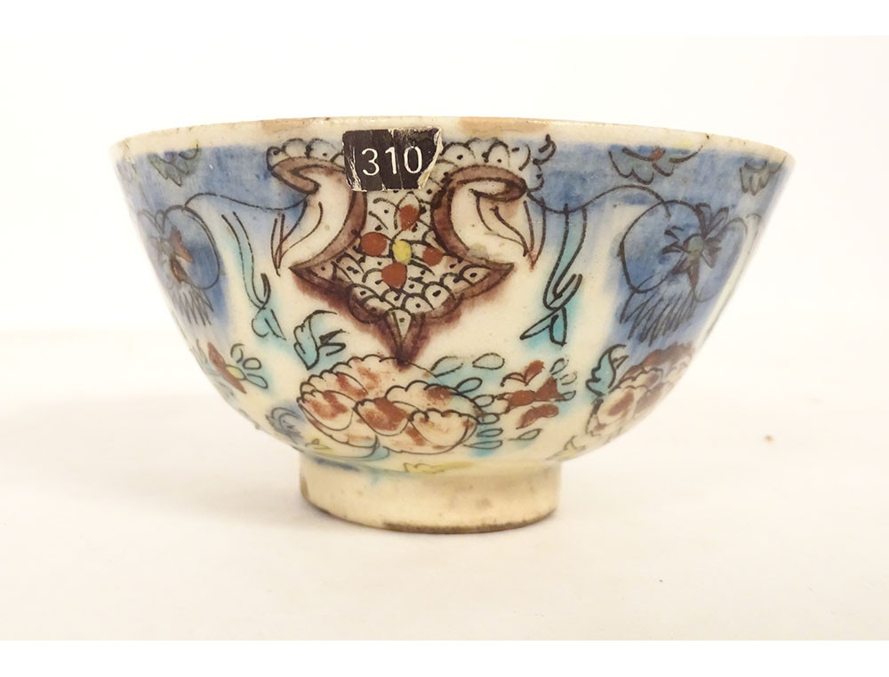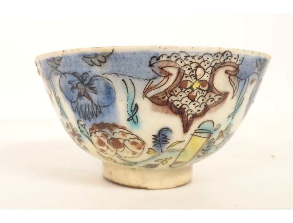 Ottoman ceramic bowl or cup from Kütahya, with rich decoration of stylized foliage, flowers and plant motif, in the background perhaps the representation of a mosque, provenance private collection (perhaps from the Muslim Art antique shop of Joseph Soustiel*), provenance Ottoman Turkey, 18th century period.