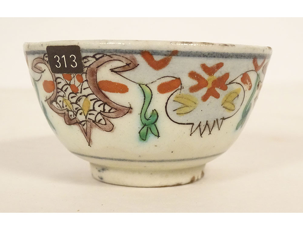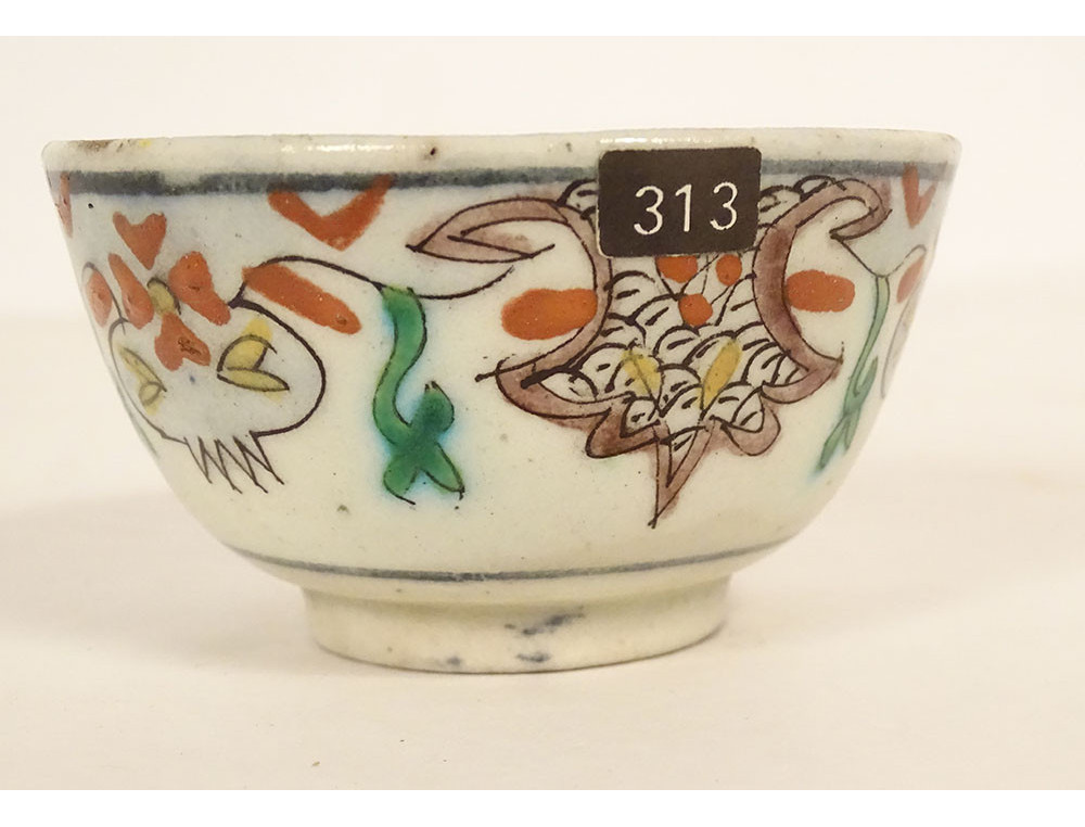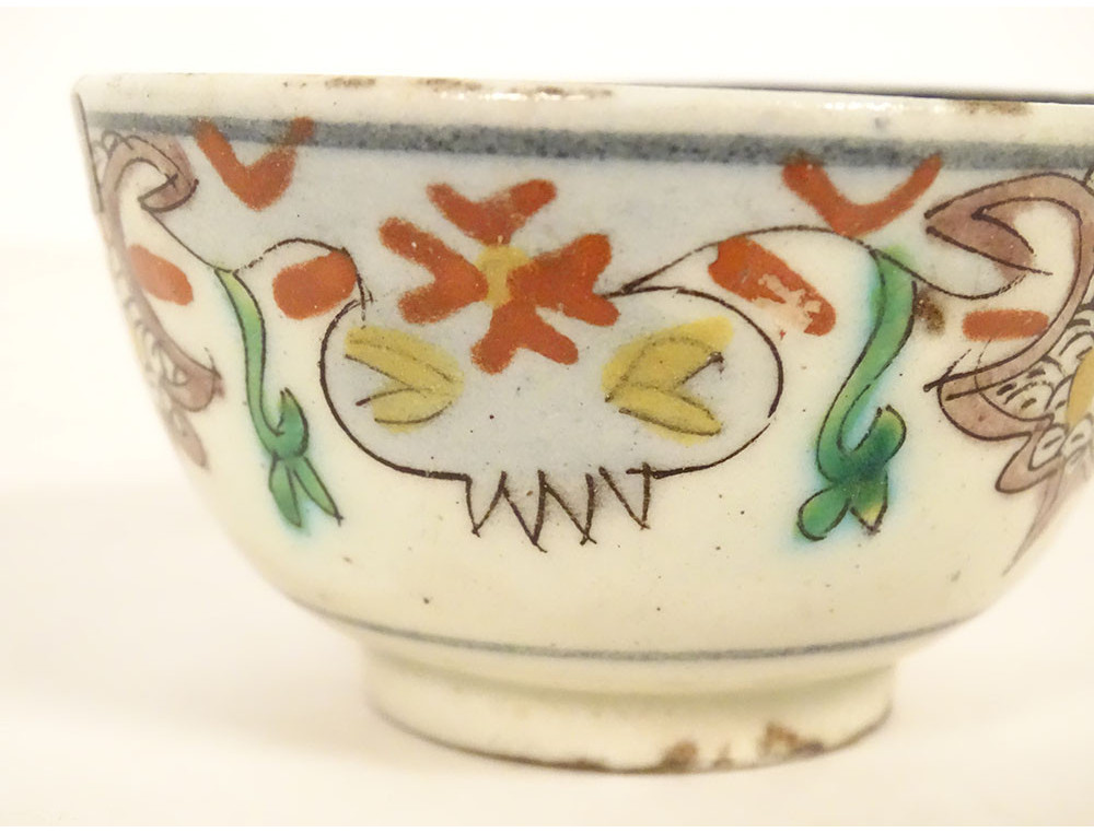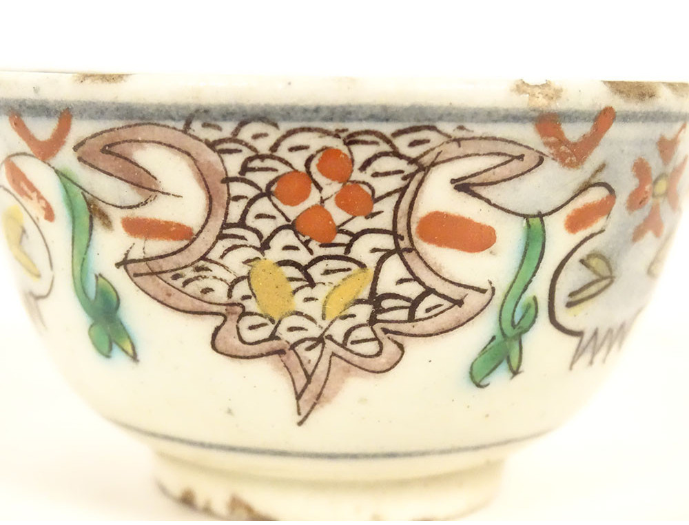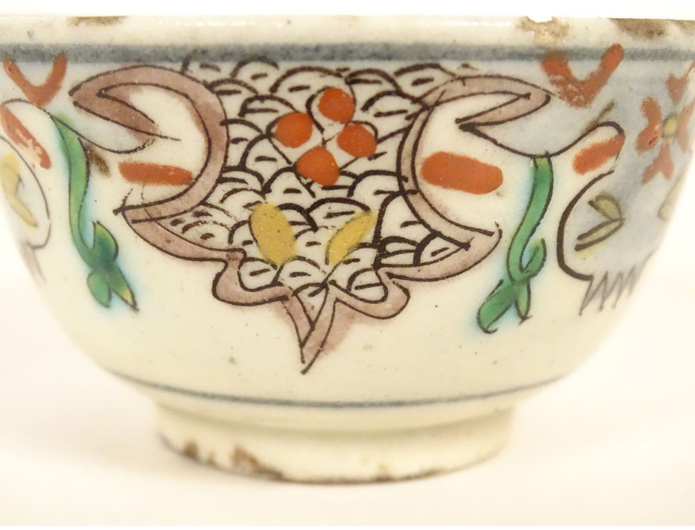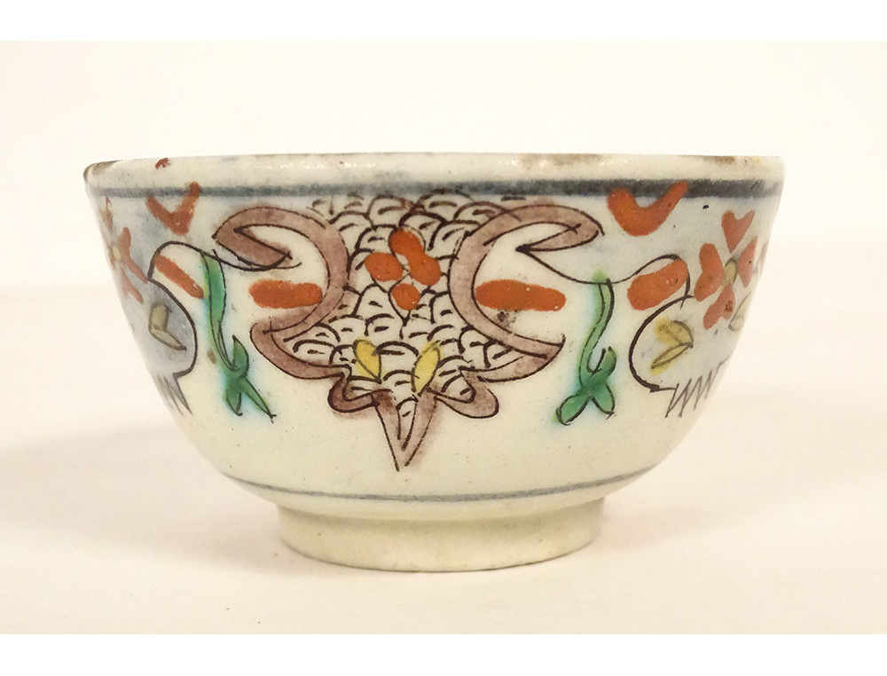Ottoman ceramic bowl or cup from Kütahya, with rich decoration of stylized foliage, flowers and plant motif, in the background perhaps the representation of a mosque, provenance private collection (perhaps from the Muslim Art antique shop of Joseph Soustiel*), provenance Ottoman Turkey, 18th century period.