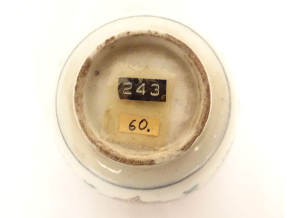 This bowl is in good overall condition. It has old collectible labels on the base.