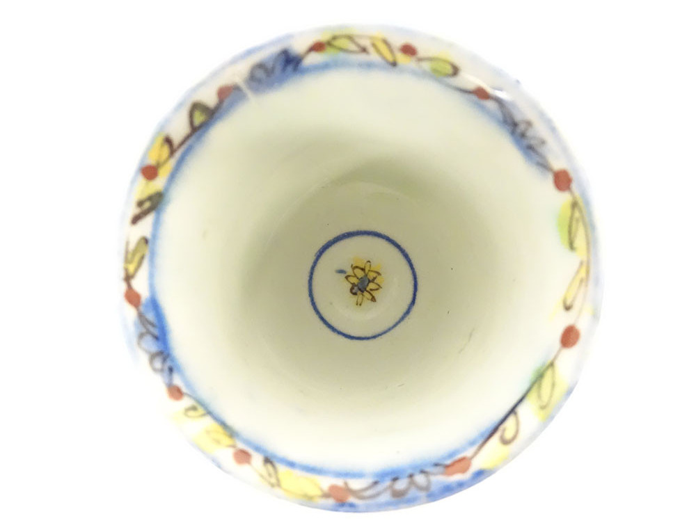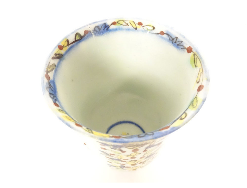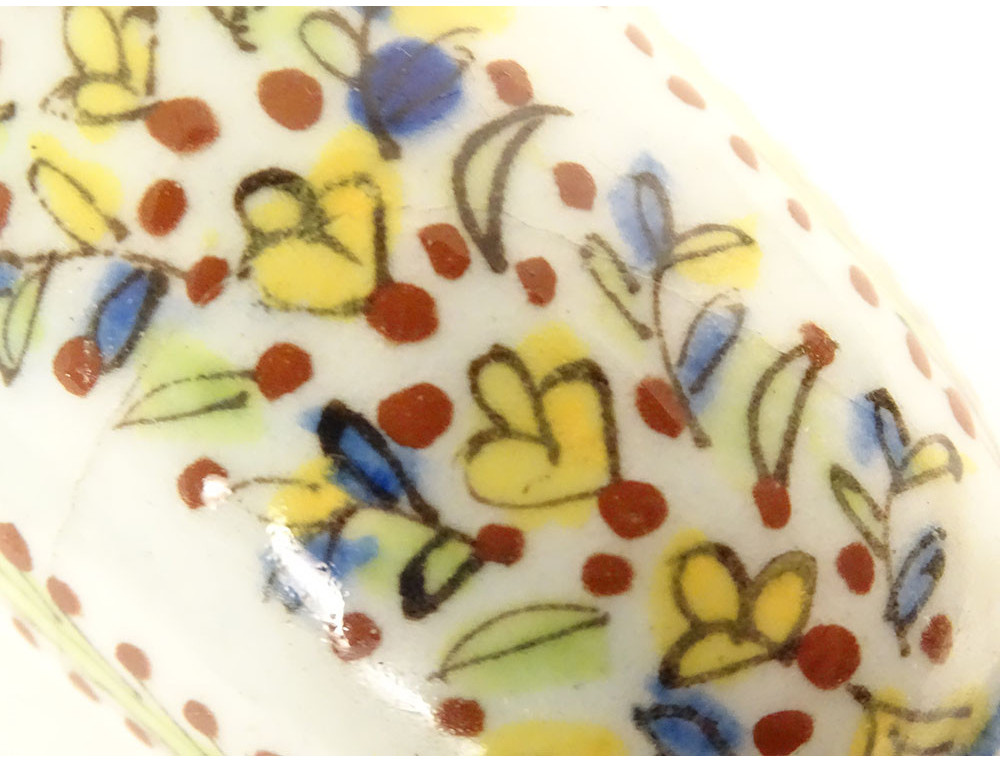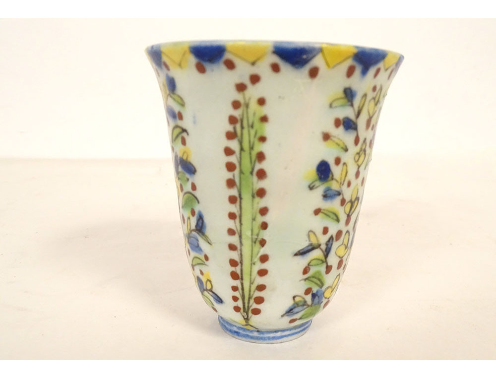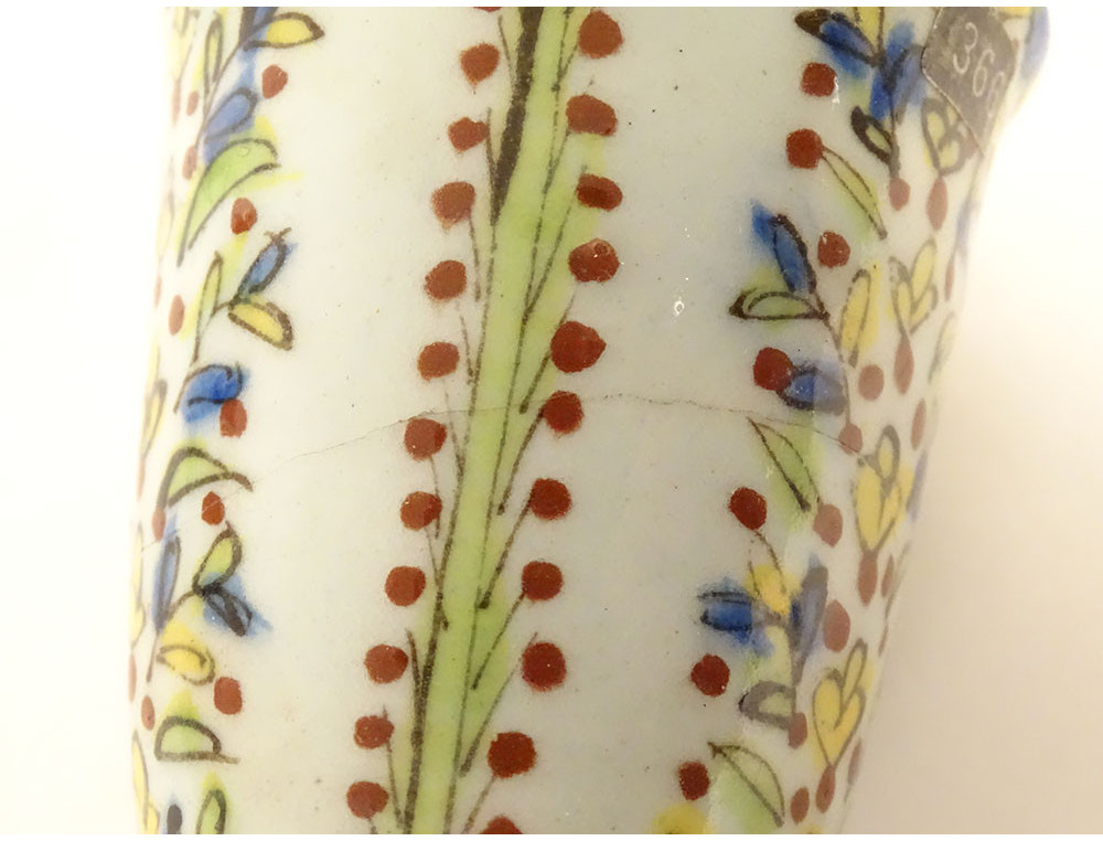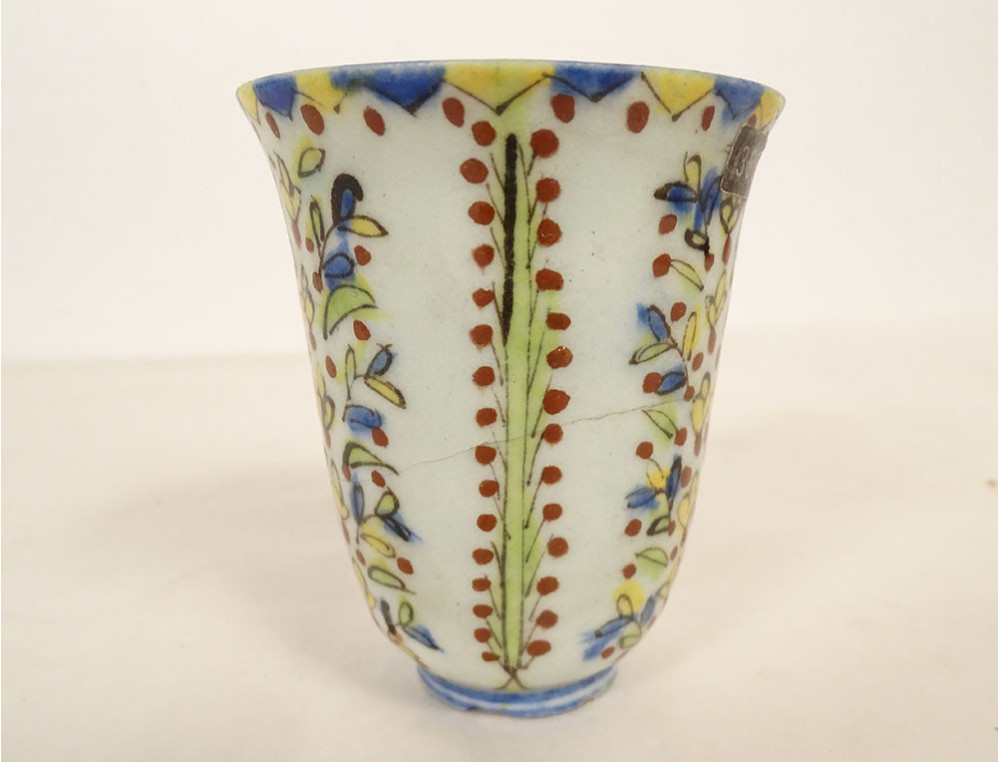 Ottoman ceramic bowl or cup from Kütahya, with rich decoration of stylized foliage, flowers and plant motif, in the background perhaps the representation of a mosque, provenance private collection (perhaps from the Muslim Art antique shop of Joseph Soustiel*), provenance Ottoman Turkey, 18th century period.