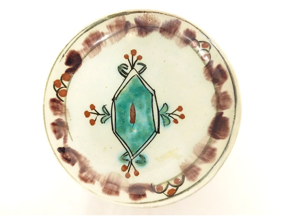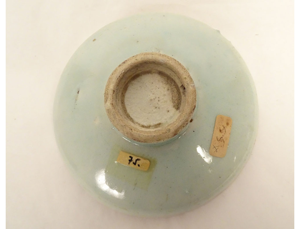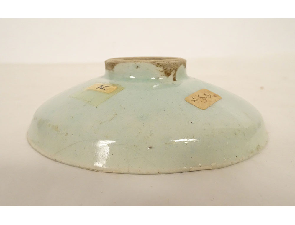 This bowl is in good overall condition. It has old collectible labels on the base.