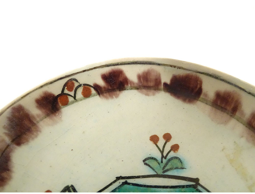 Ottoman ceramic bowl or cup from Kütahya, with rich decoration of stylized foliage, flowers and plant motif, in the background perhaps the representation of a mosque, provenance private collection (perhaps from the Muslim Art antique shop of Joseph Soustiel*), provenance Ottoman Turkey, 18th century period.