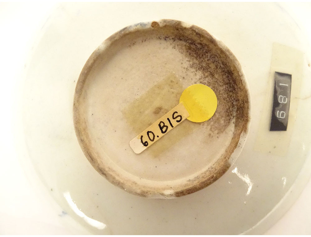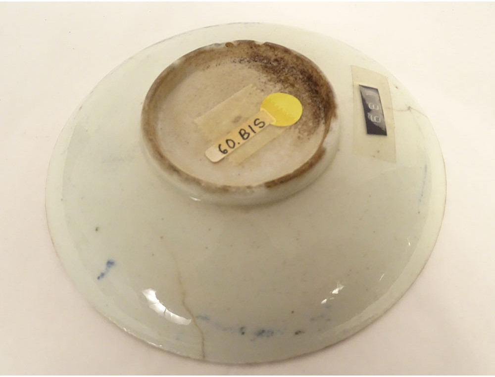 This bowl is in good overall condition. It has old collectible labels on the base.