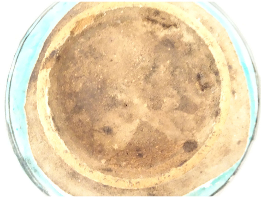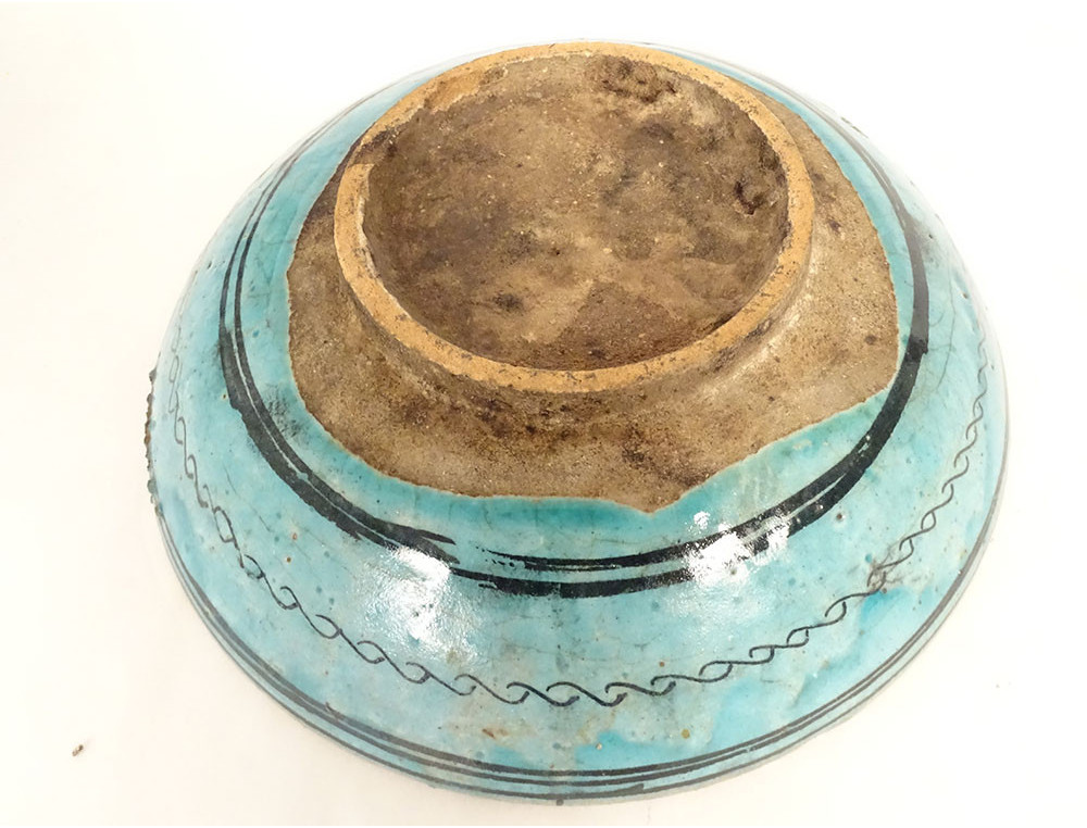 This bowl is in good overall condition. It has old collectible labels on the base.