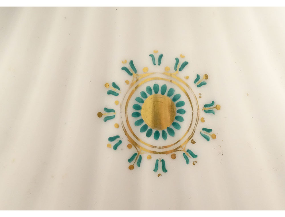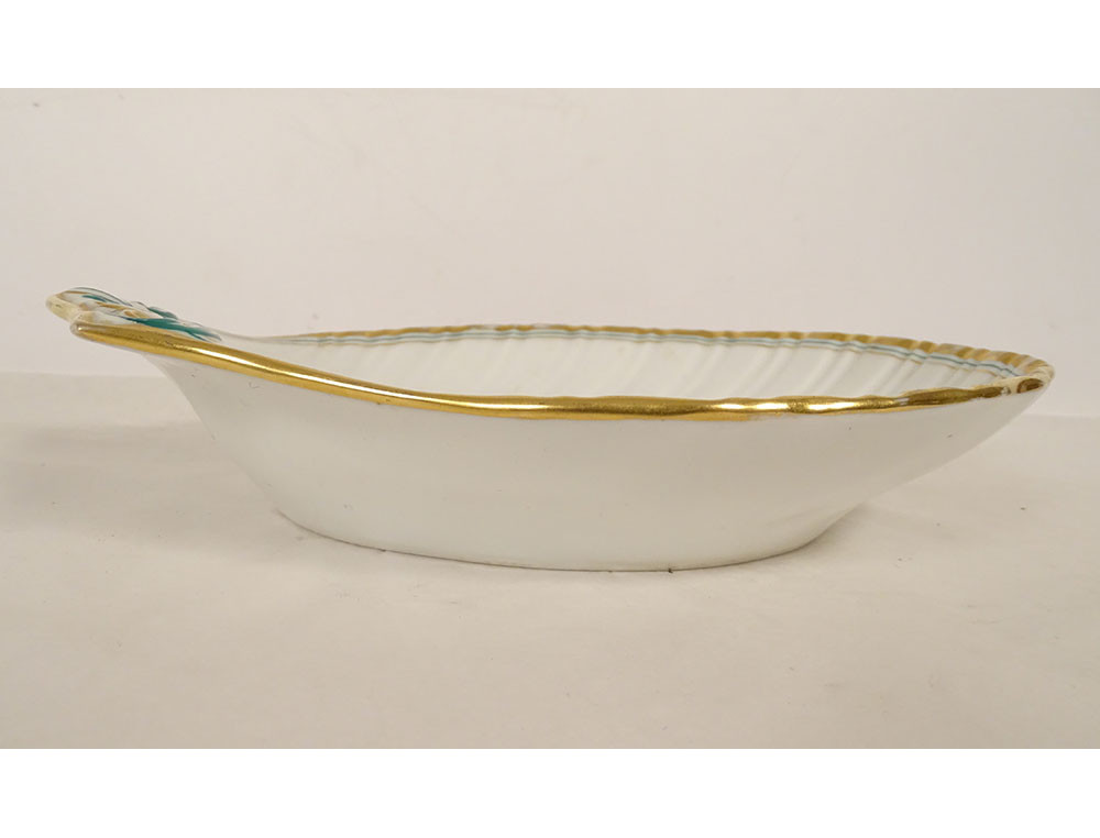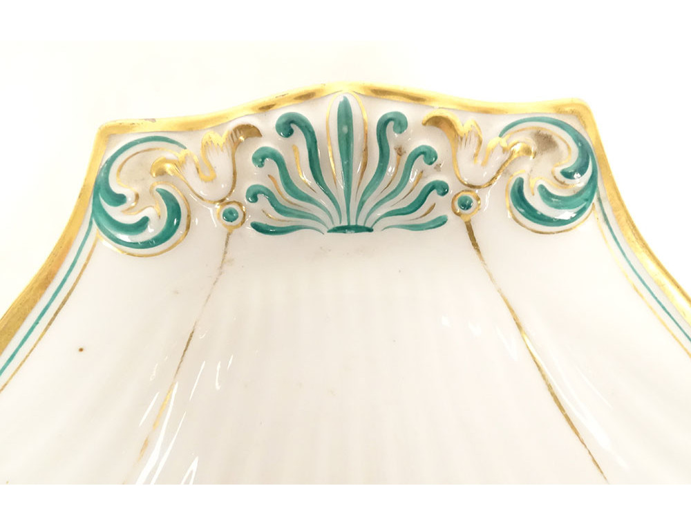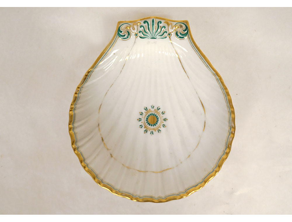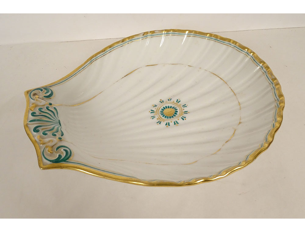 Empire-style shell-shaped serving dish, made of Paris porcelain enhanced with green lines and gilding, decorated with palmette and foliage, from the Louis-Philippe period, 19th century.