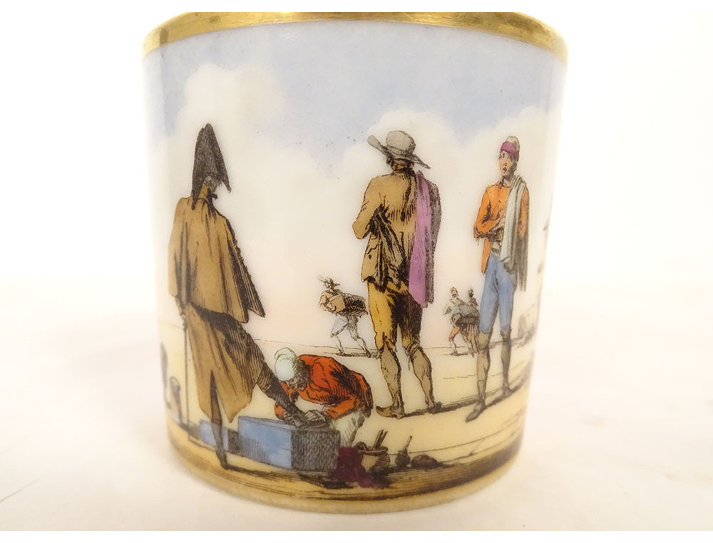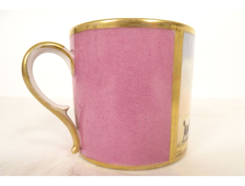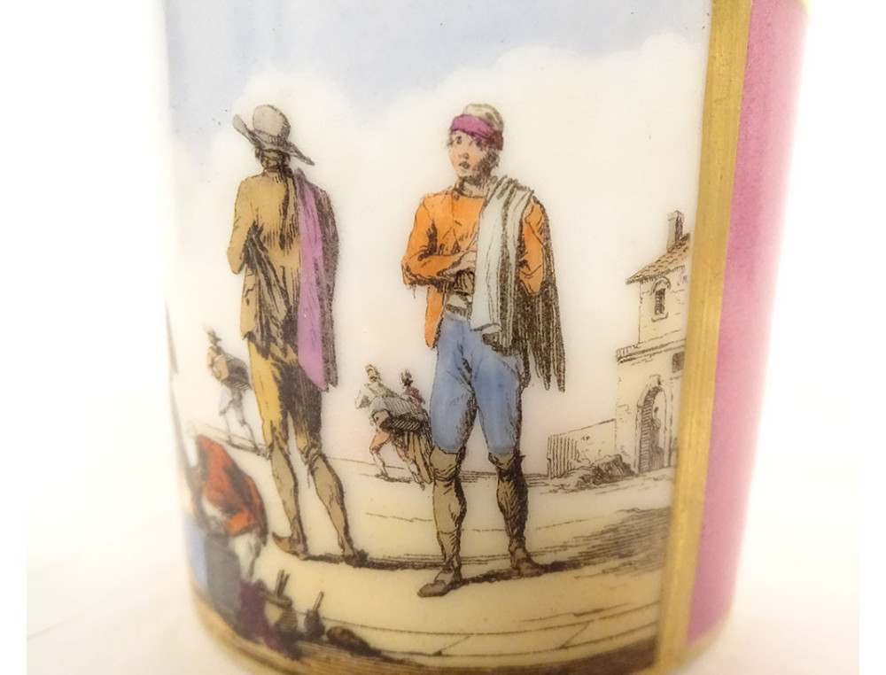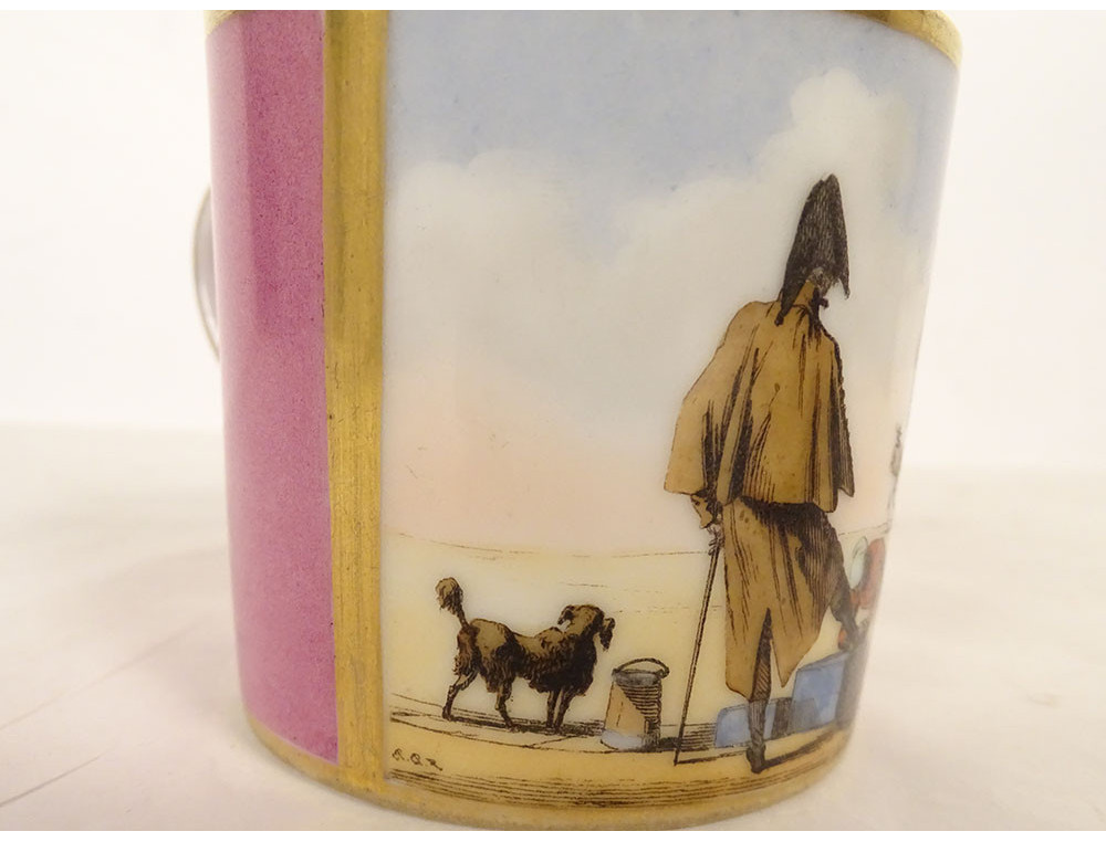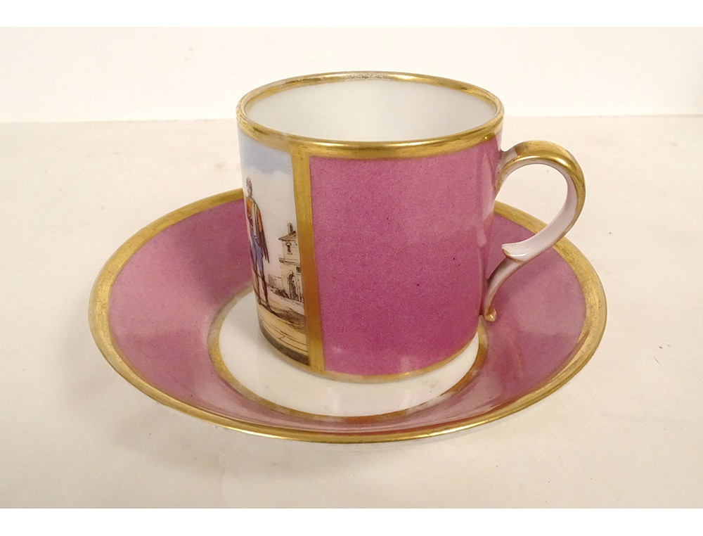 A Paris porcelain cup and saucer with a pink background enhanced with gilding, featuring a painted scene depicting several characters: a gentleman having his shoes cleaned, a small dog by his side, and various workers transporting goods, dating from the late 19th century.