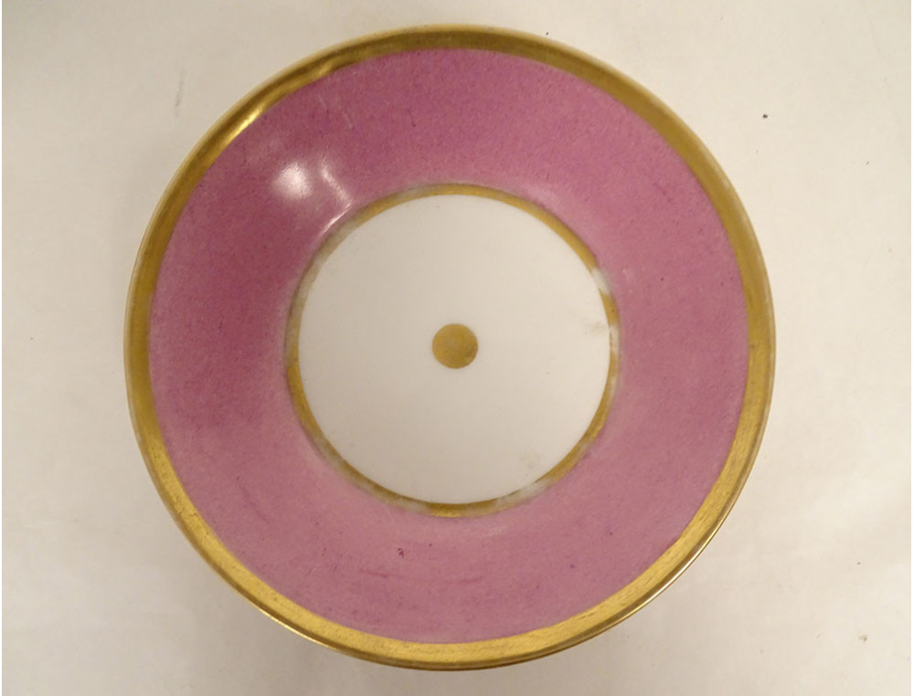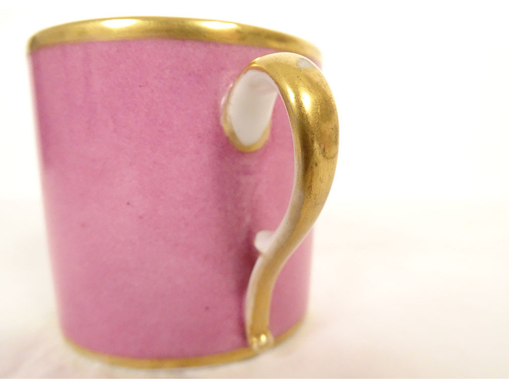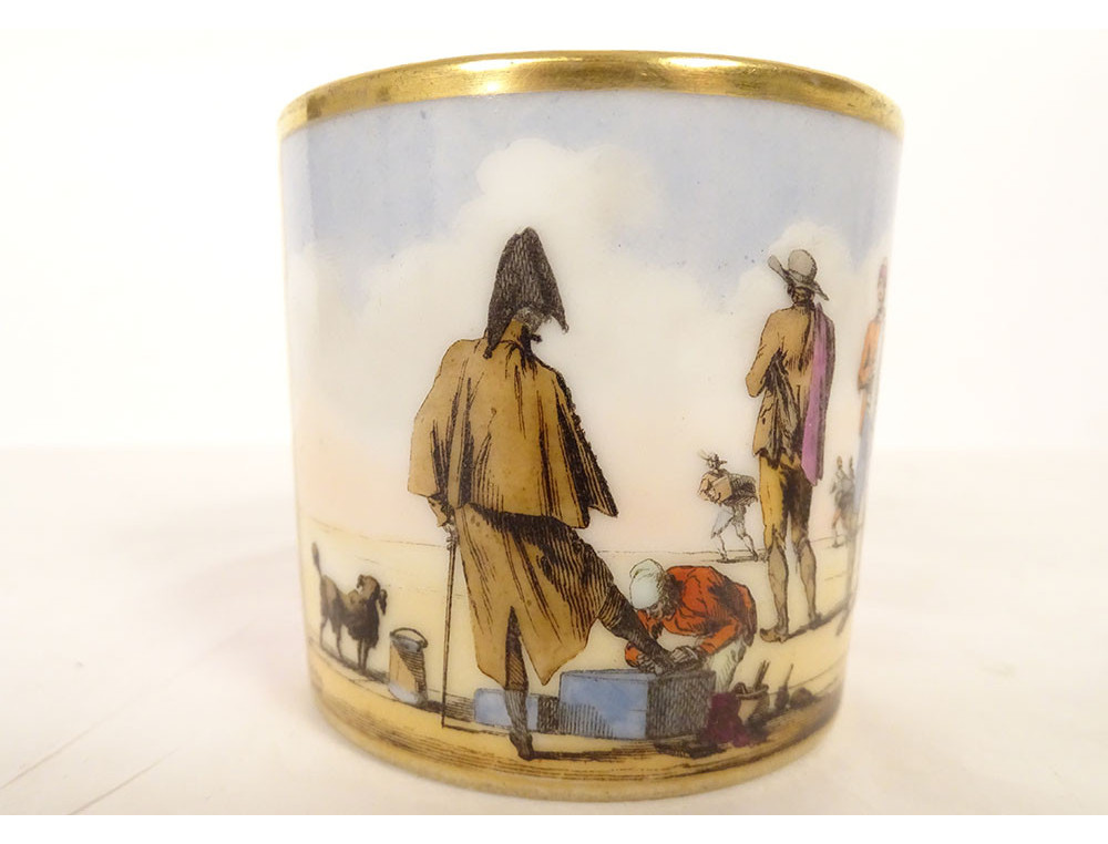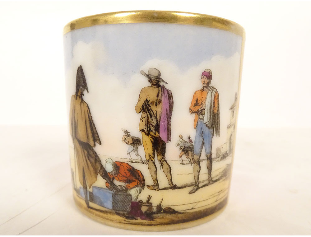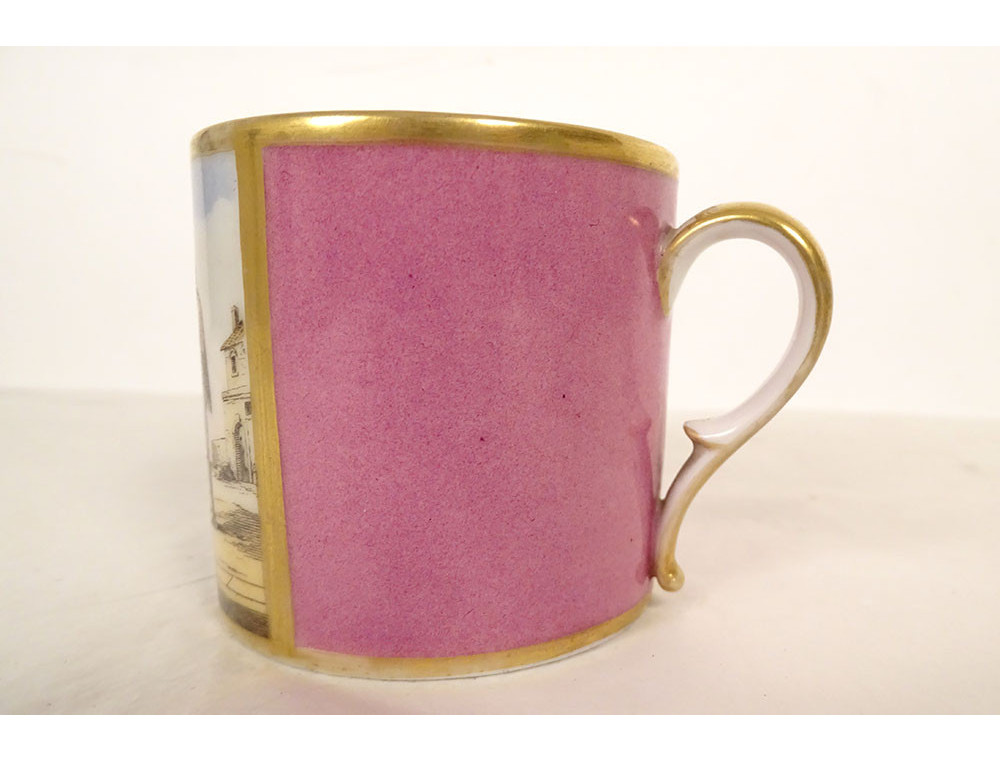 A Paris porcelain cup and saucer with a pink background enhanced with gilding, featuring a painted scene depicting several characters: a gentleman having his shoes cleaned, a small dog by his side, and various workers transporting goods, dating from the late 19th century.