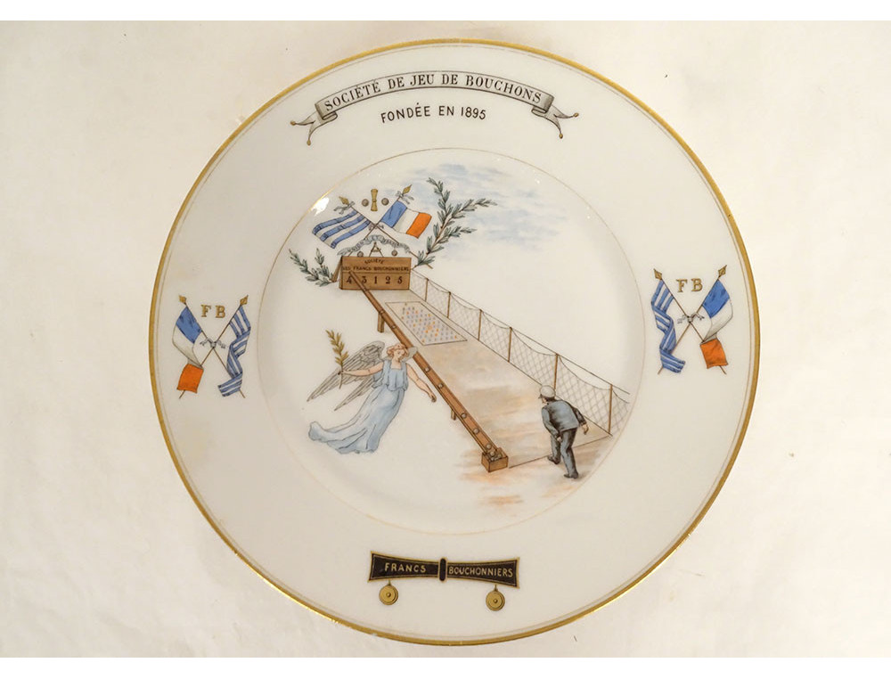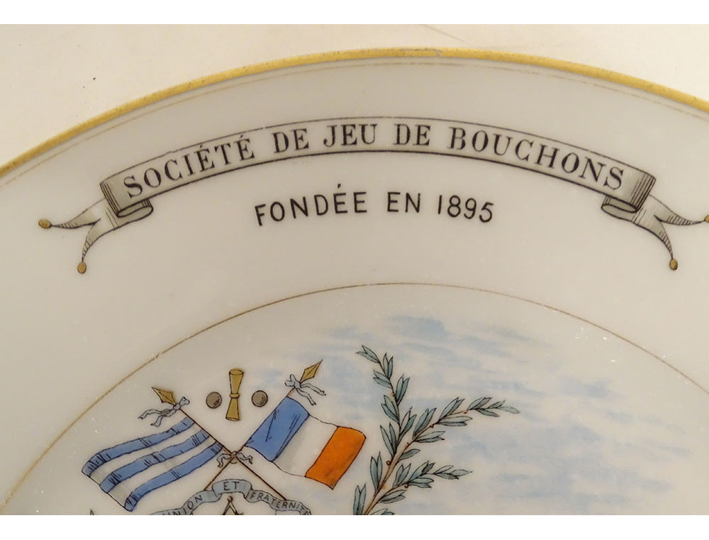 Paris porcelain plate signed Jullien Fils Aîné 63 Fg Poissonnière (1855 1st class) dedicated to the Société du Jeu de Bouchon founded in 1895 known as the Francs Bouchonniers, representing a man playing it, from the late 19th century.