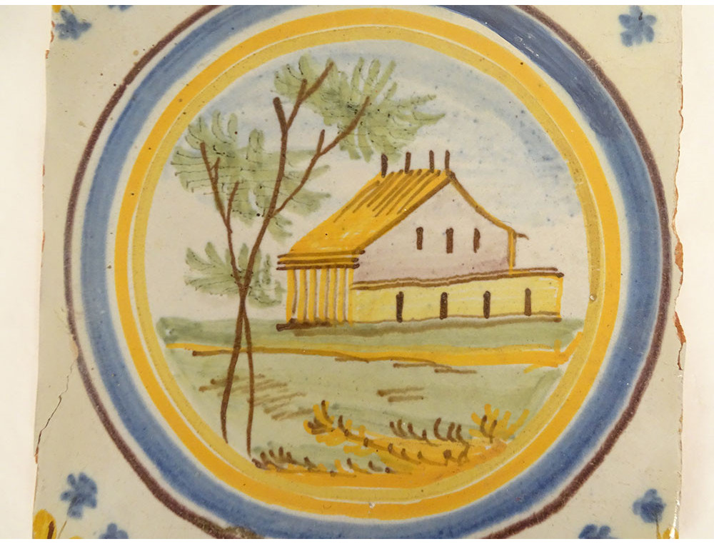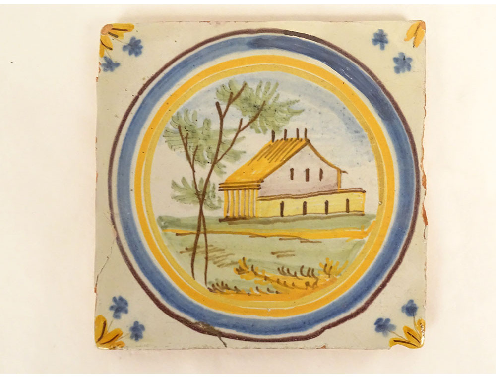 Polychrome Nevers earthenware tile, with a central decoration of a beautiful house or country house, in a wooded landscape, small flowers in the corners, from the 18th century.