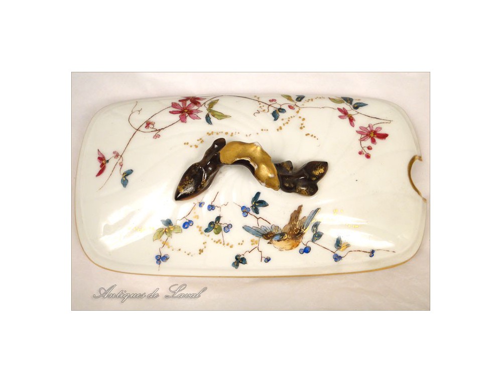 Limoges porcelain sauce boat decorated with birds fluttering among flowering branches, loops and handles shaped tree branches, signed W.Guérin & Co. *, period late nineteenth and early twentieth centuries.