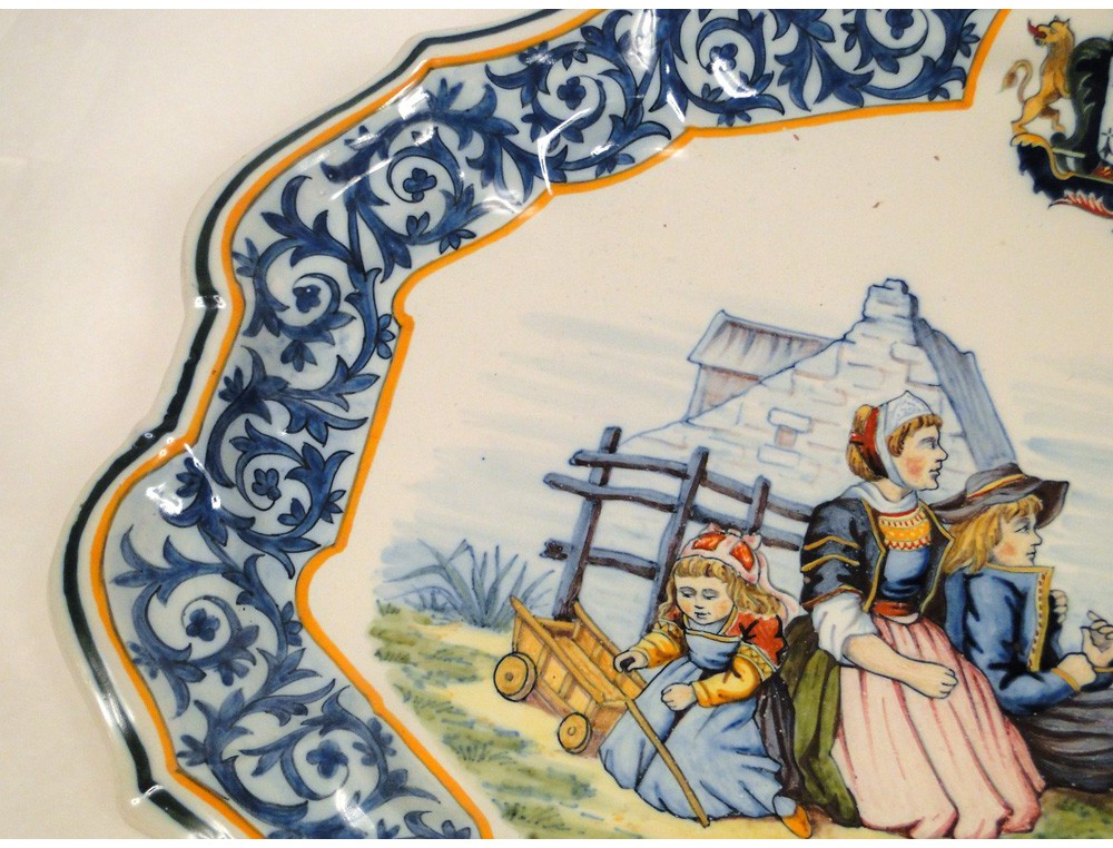 Superb flat oval edges bypassed in Quimper faience signed Porquier PB-Beau *, representing a picturesque scene with a narrator telling a story to a young woman and her two children in the garden of a cottage, decorated with coats of arms (crowned shield flanked by two lions) at the top, vintage early twentieth century.