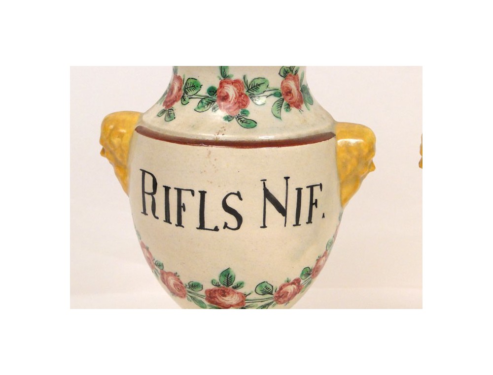 Pair of pots covered medicine, fine earthenware certainly in Italy, decorated with garlands of flowers and heads of characters on the sides, marked "Rifls Nif" and "Nitvls" of XIXth century.