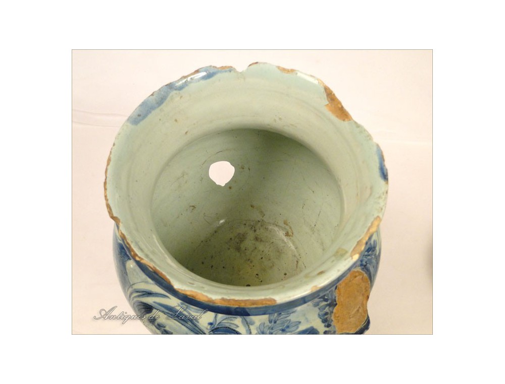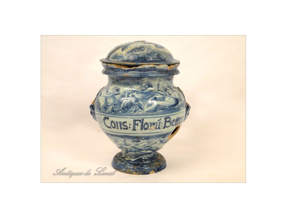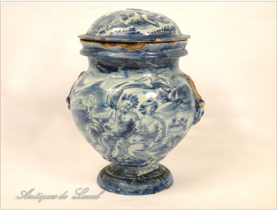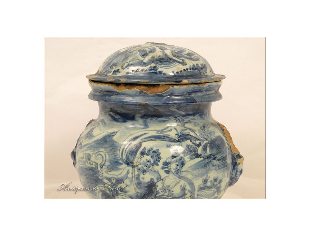 Earthenware pot pharmacy Italian, blue decorated mythological figures (gods and goddesses Roman) and cherubs, vintage late seventeenth century.