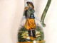 Very nice vinegar cruet holder signed HR Quimper faience, decorated with two characters Breton: A woman picking up a flower and a piper, feet shaped support legs lions, vintage late nineteenth and early twentieth centuries.