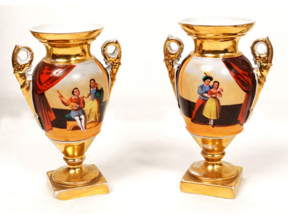 Very nice pair of porcelain vases Medicis Paris, decorated with two love scenes as well as views of houses in rural landscapes, time of Louis Philippe nineteenth century.