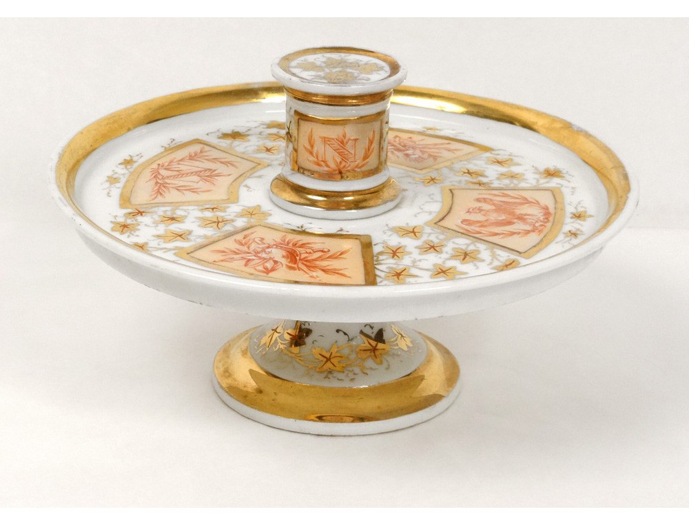 Very nice fruit bowl Paris porcelain, decorated weapons of the Emperor Napoleon I and its various attributes: Imperial eagle, laurel wreath, helmet and sword, torch and quiver, all surrounded by ivy leaves and gilding, I Empire period of the early nineteenth century.