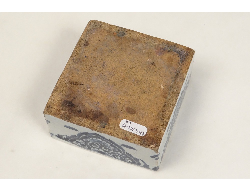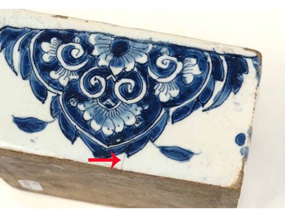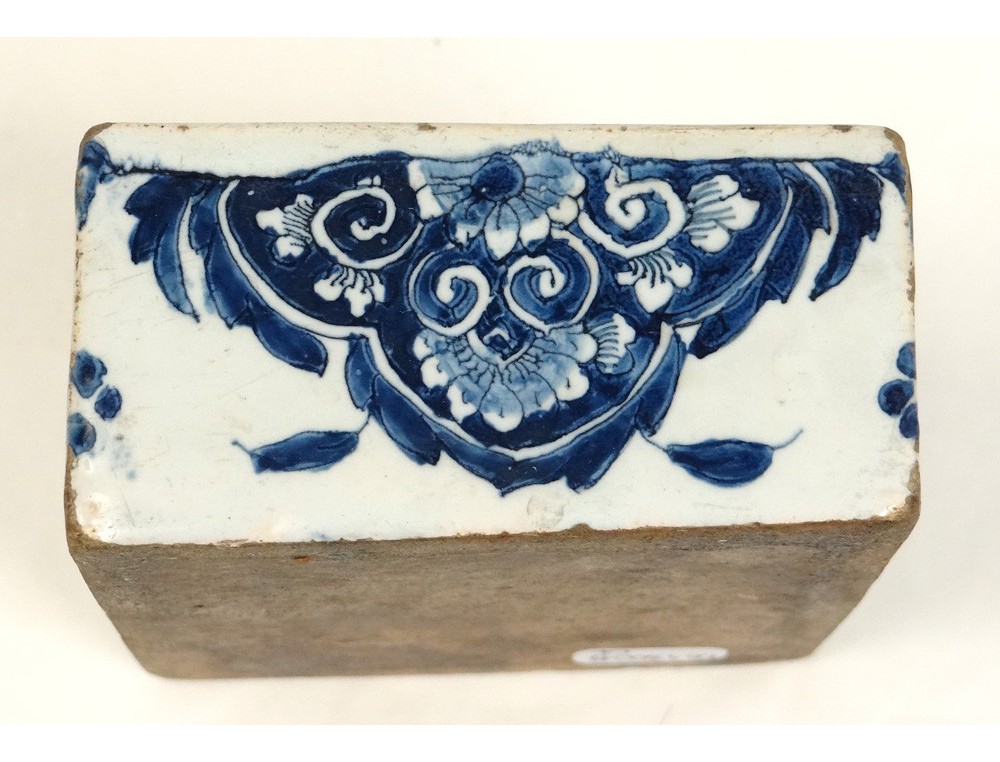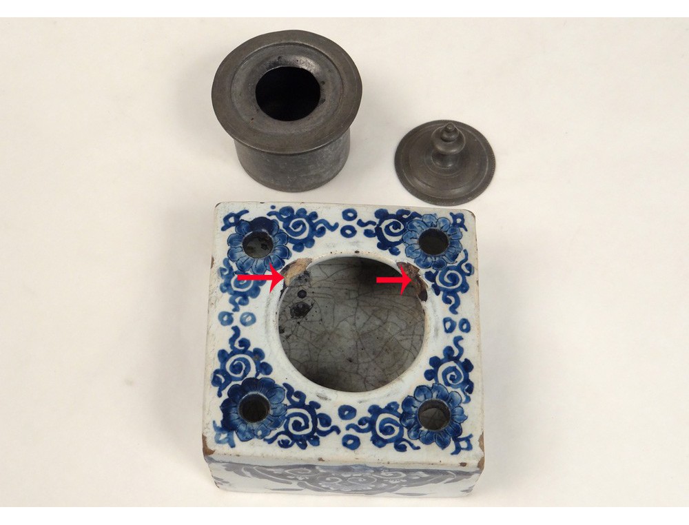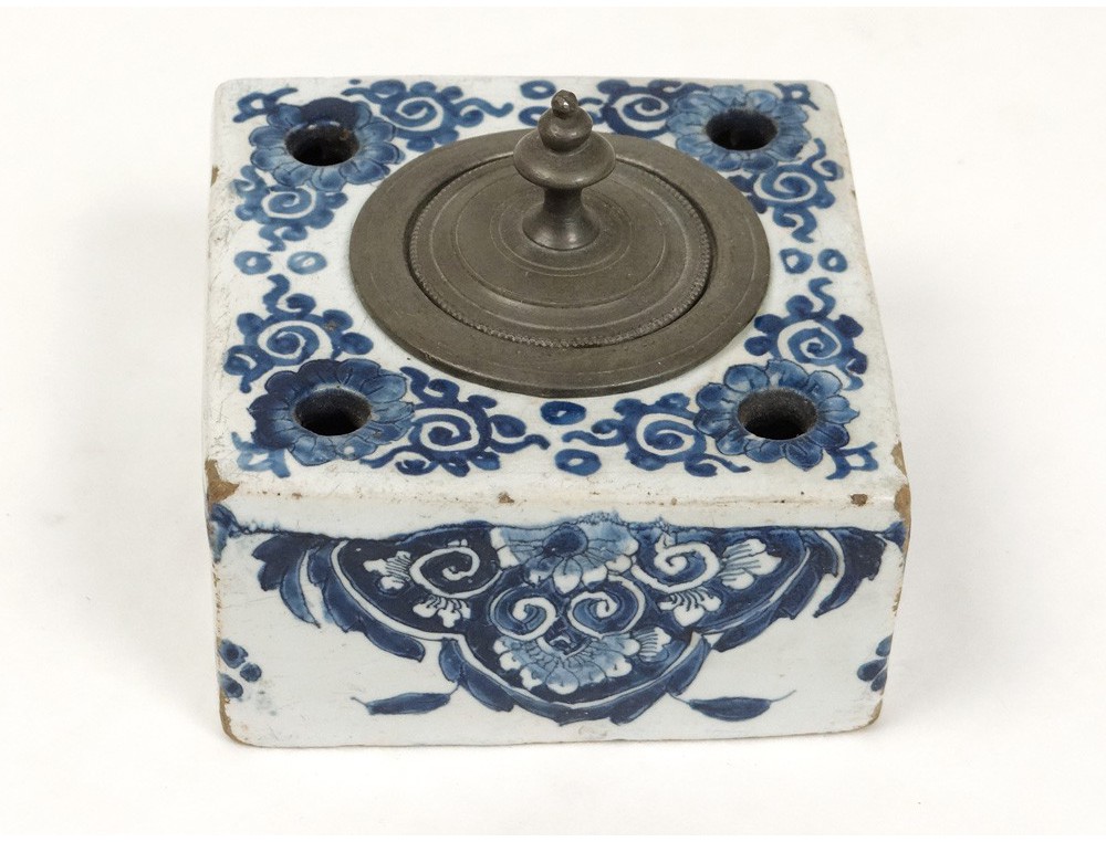 Beautiful tiled fountain certainly Rouen or Lille, plant and floral arabesques decor, with its original tin inkwell, antique eighteenth century era.