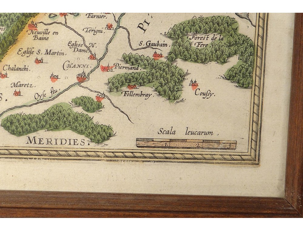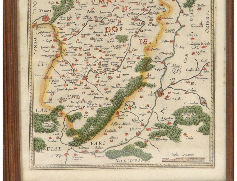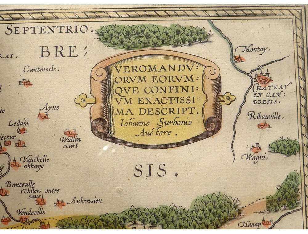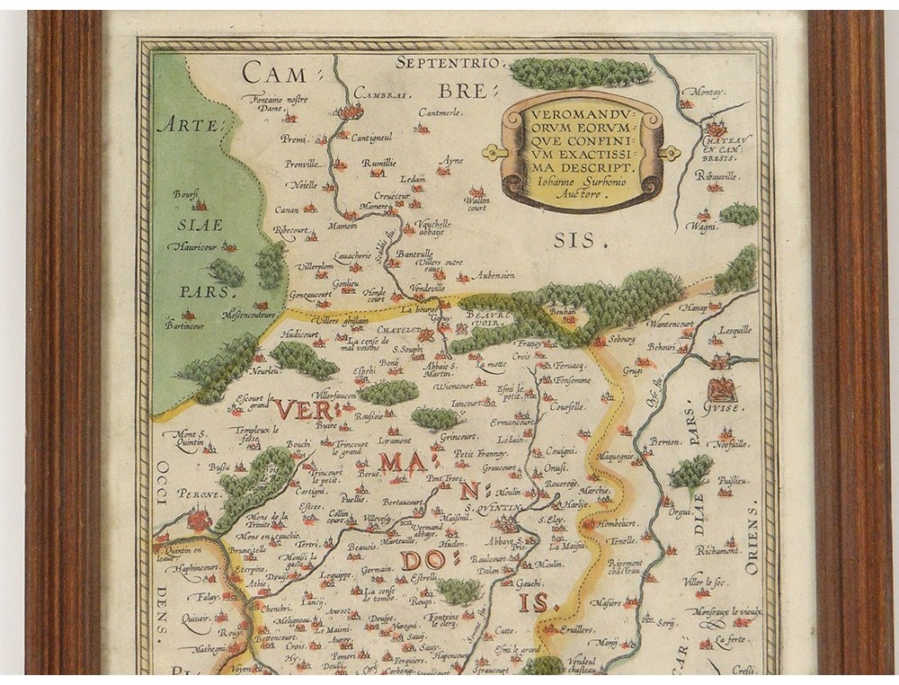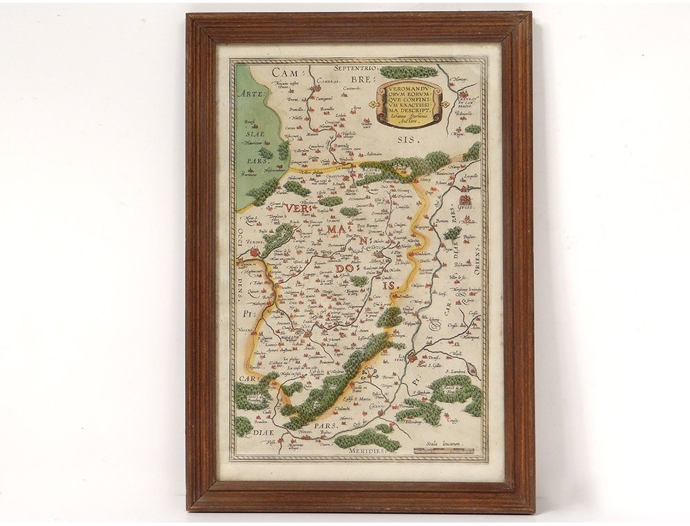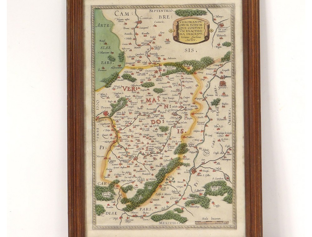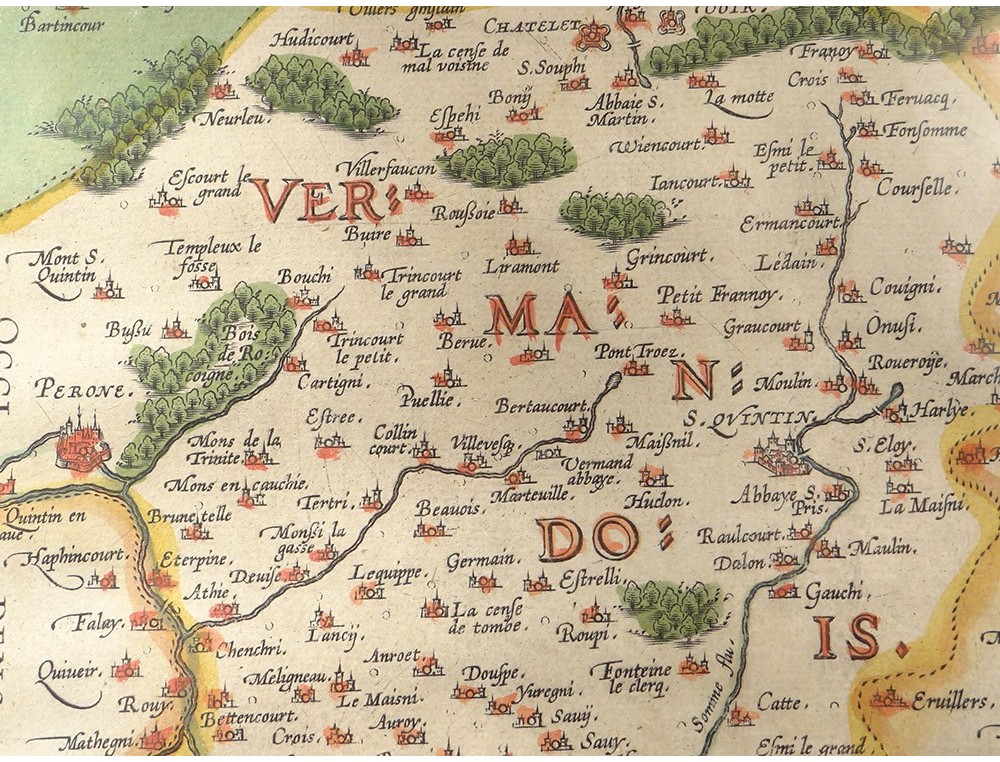 Watercolor engraving depicting a map of the Pays de Vermandois, made by Jean Surhon, from the 16th century.