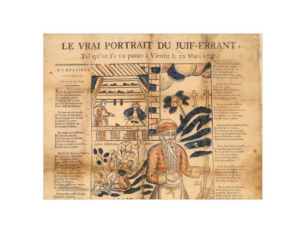 Lovely watercolor print titled "The true picture of the Wandering Jew, as we have seen pass in Vienna March 22, 1777," with a poem surrounding the representation of a Jewish man in Toulouse in L.Abadie younger period eighteenth century.