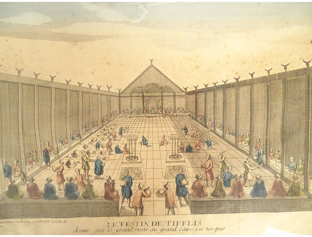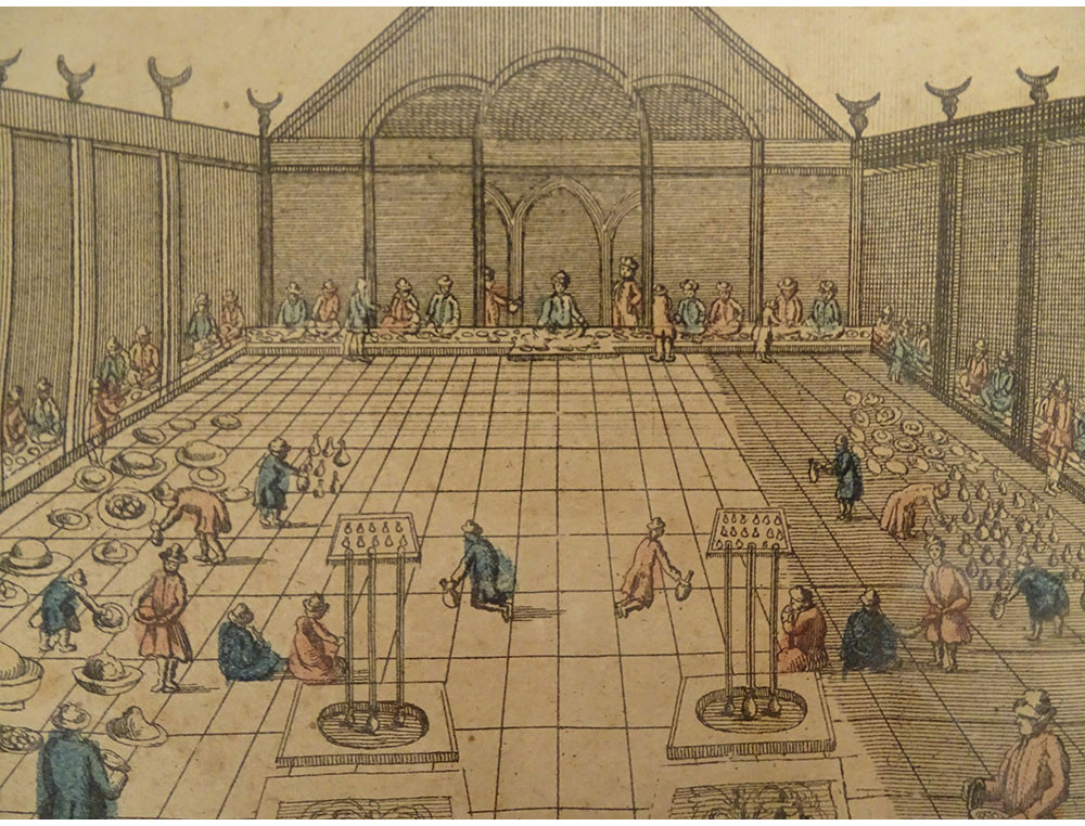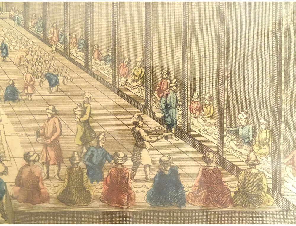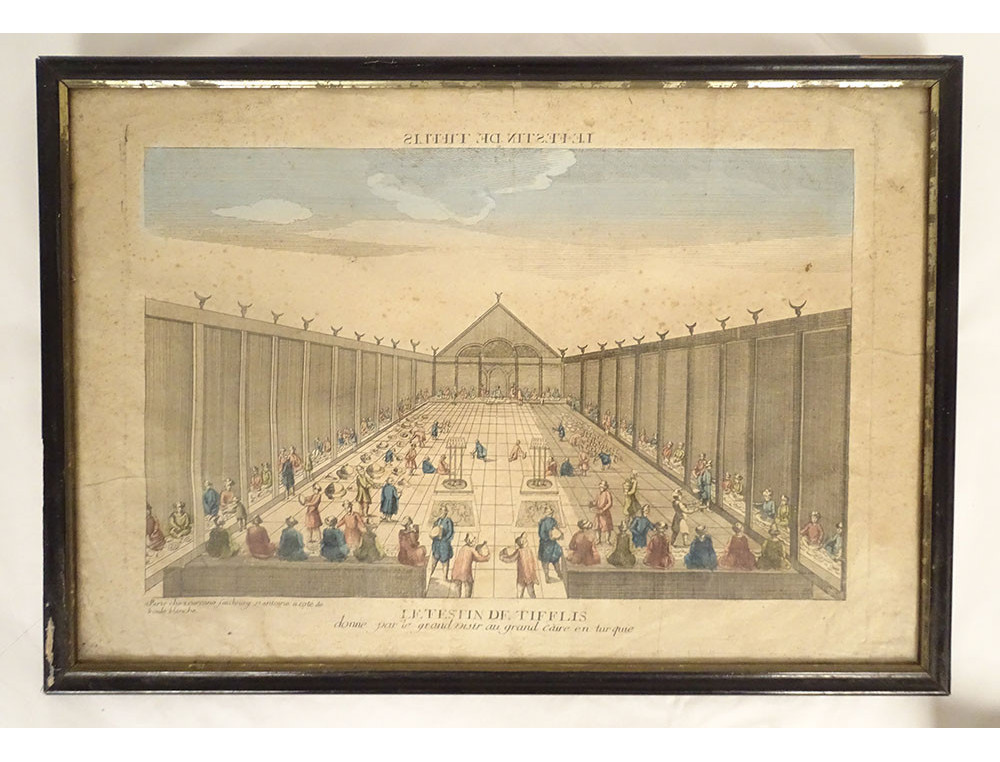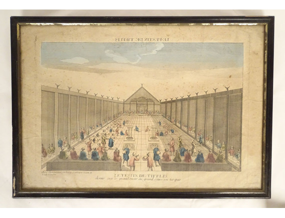 Watercolored optical view representing a view of Baïonne (Bayonne) in the Basque country (South West), in Paris at Basset* rue St Jacques in Ste Geneviève, from the late 18th-early 19th centuries.