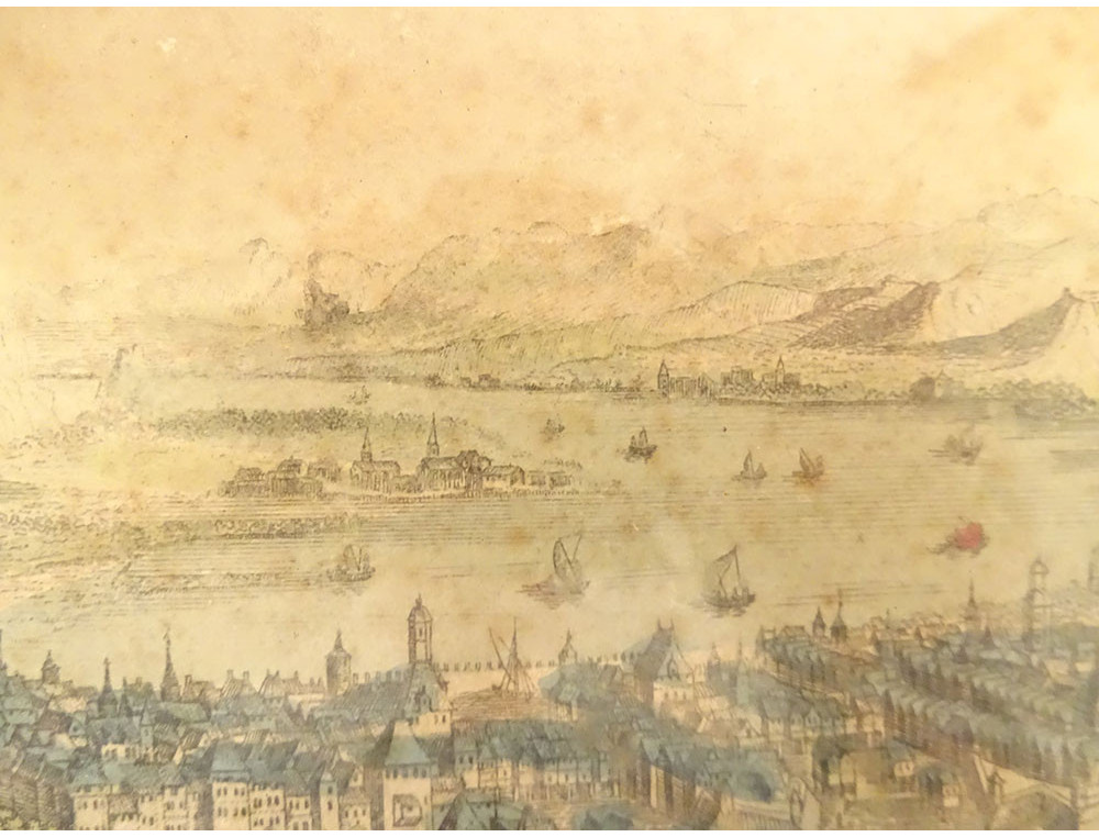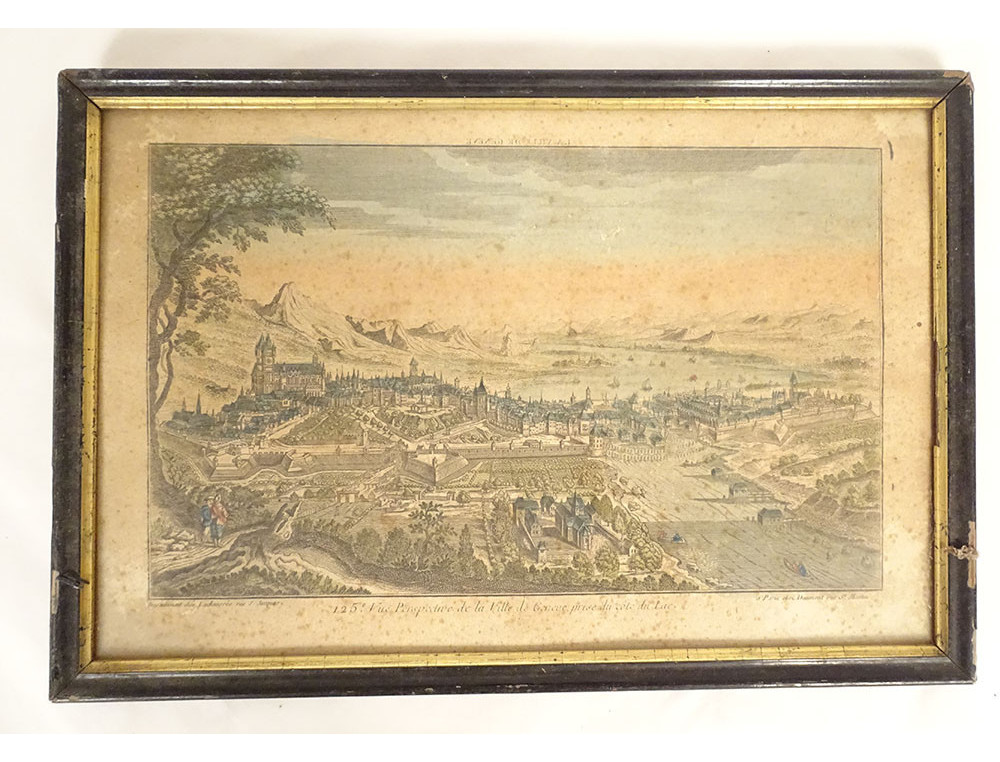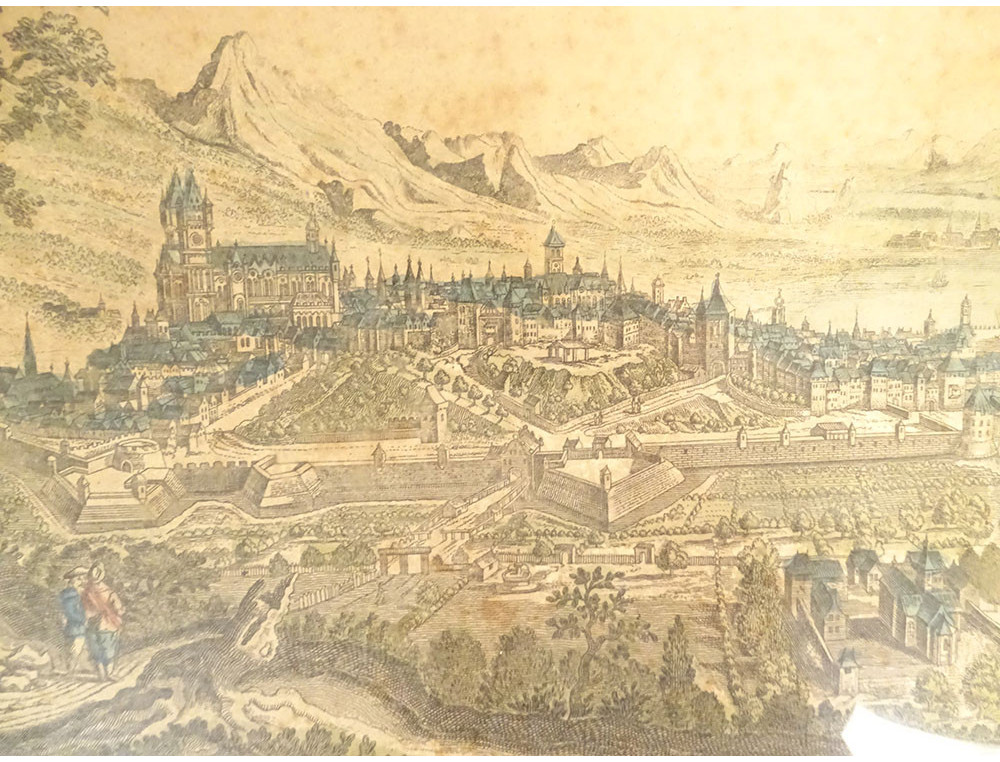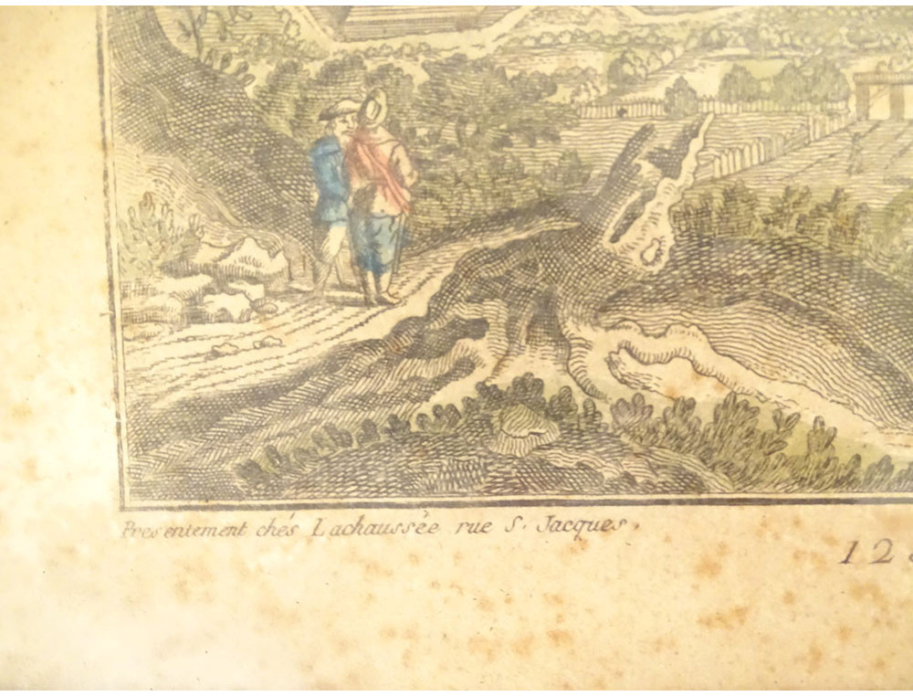 Watercolored optical view representing a view of Baïonne (Bayonne) in the Basque country (South West), in Paris at Basset* rue St Jacques in Ste Geneviève, from the late 18th-early 19th centuries.