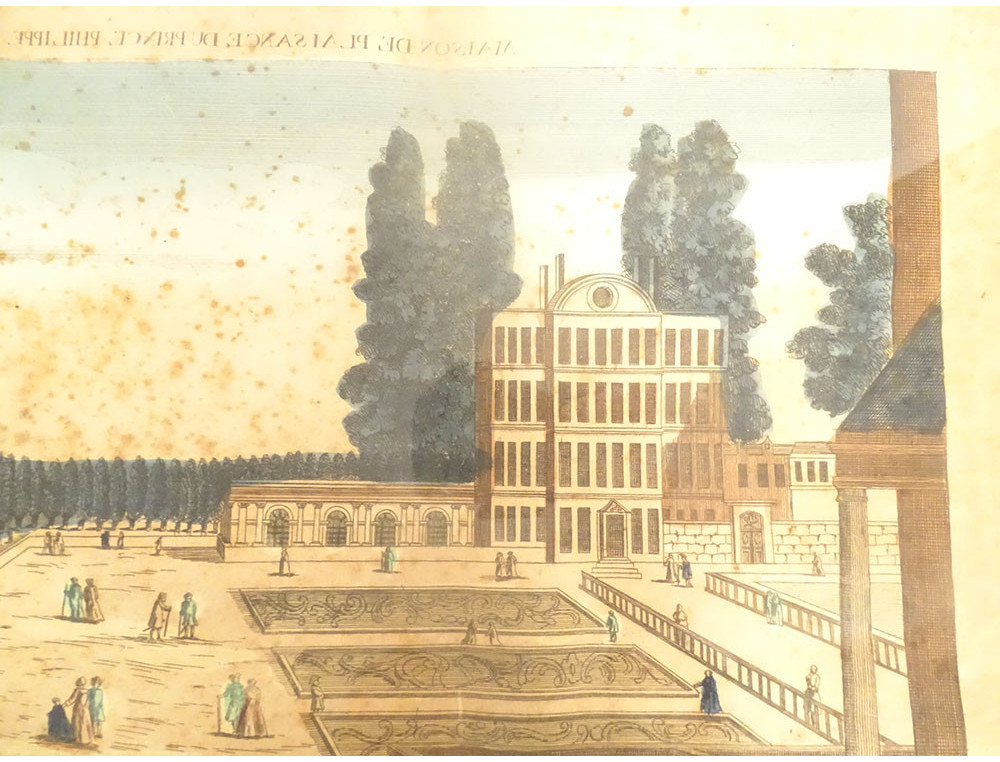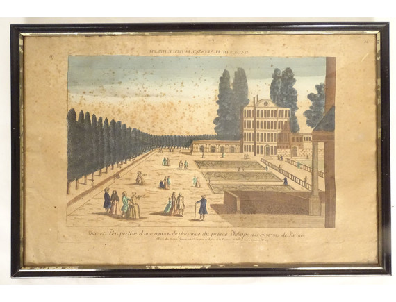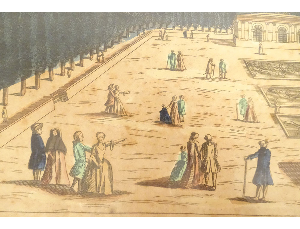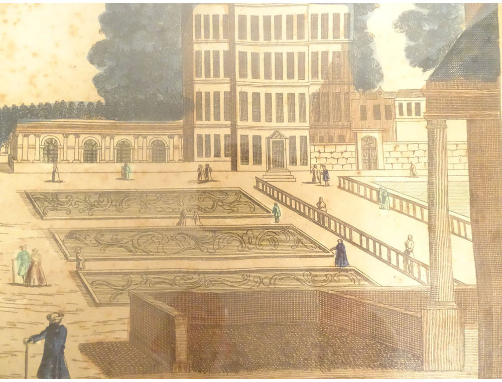 Watercolored optical view representing a view of Baïonne (Bayonne) in the Basque country (South West), in Paris at Basset* rue St Jacques in Ste Geneviève, from the late 18th-early 19th centuries.