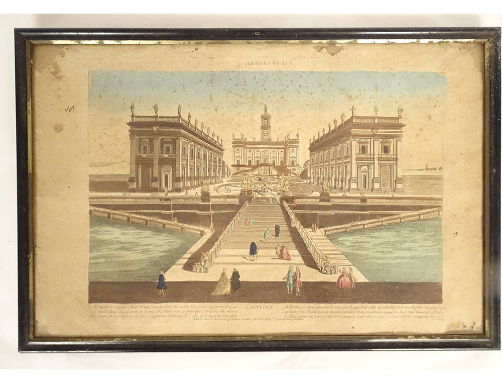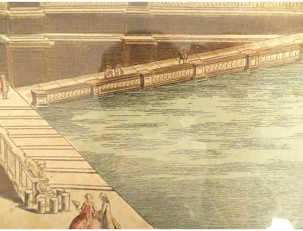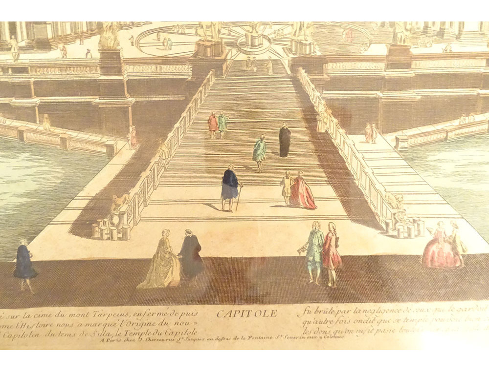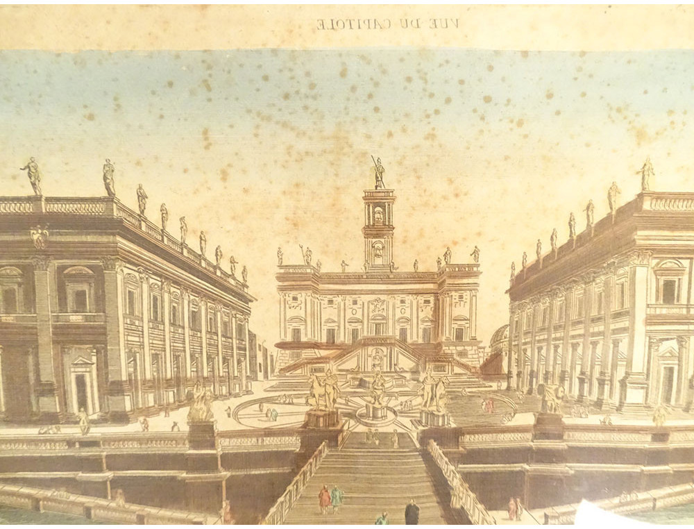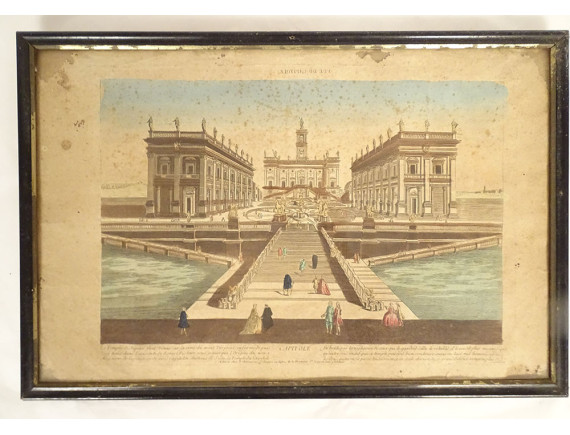 Watercolored optical view representing a view of Baïonne (Bayonne) in the Basque country (South West), in Paris at Basset* rue St Jacques in Ste Geneviève, from the late 18th-early 19th centuries.
